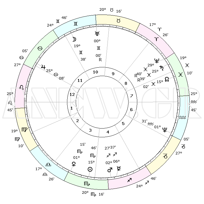| | ΘΕΣΕΙΣ ΠΛΑΝΗΤΩΝ ΑΣΤΡΟΛΟΓΙΚΟΥ ΧΑΡΤΗ ΤΗΣ ΣΤΙΓΜΗΣ ΑΥΤΗΣ | | | | Πλανήτης | Ζώδιο | Μοίρες | Δεκαήμ. | Σε οίκο | Απόκλιση | | Ακμές των οίκων | | Ηλιος | Σκορπιός | 15°35' | Δεύτερο | 5 | 16 S 30 | | 1ος | 01°16' | Καρκίνος | | Σελήνη | Δίδυμοι | 16°53' | Δεύτερο | 12 | 27 N 50 | | 2ος | 21°59' | Καρκίνος | | Ερμής | Τοξότης | 06°34' | Πρώτο | 6 | 23 S 58 | | 3ος | 13°53' | Λέων | | Αφροδίτη | Σκορπιός | 01°01' | Πρώτο | 5 | 10 S 33 | | 4ος | 10°24' | Παρθένος | | Αρης | Τοξότης | 02°19' | Πρώτο | 6 | 21 S 04 | | 5ος | 14°32' | Ζυγός | | Δίας | Καρκίνος | 25°08' | Τρίτο | 2 | 21 N 12 | | 6ος | 24°26' | Σκορπιός | | Κρόνος | Ιχθείς | 25°39'R | Τρίτο | 10 | 03 S 58 | | 7ος | 01°16' | Αιγόκερως | | Ουρανός | Δίδυμοι | 00°00'R | Πρώτο | 12 | 19 N 57 | | 8ος | 21°59' | Αιγόκερως | | Ποσειδώνας | Ιχθείς | 29°40'R | Τρίτο | 10 | 01 S 23 | | 9ος | 13°53' | Υδροχόος | | Πλούτωνας | Υδροχόος | 01°31' | Πρώτο | 8 | 23 S 30 | | 10ος | 10°24' | Ιχθείς | | Β. Δεσμός | Ιχθείς | 15°03' | Δεύτερο | 10 | 05 S 53 | | 11ος | 14°32' | Κριός | | Ωροσκόπος | Καρκίνος | 01°16' | Πρώτο | | | 12ος | 24°26' | Ταύρος | | Μεσουράνημα | Ιχθείς | 10°24' | Δεύτερο | | | |