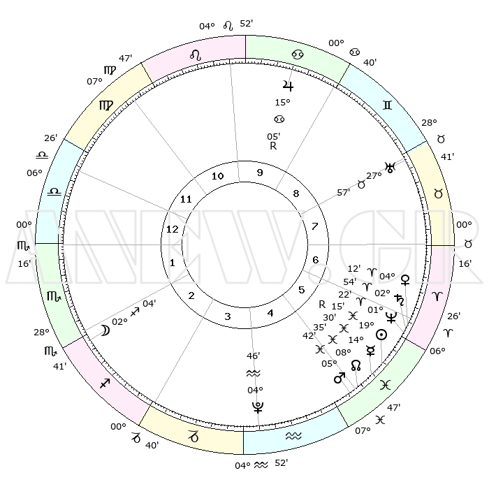 | | ΘΕΣΕΙΣ ΠΛΑΝΗΤΩΝ ΑΣΤΡΟΛΟΓΙΚΟΥ ΧΑΡΤΗ ΤΗΣ ΣΤΙΓΜΗΣ ΑΥΤΗΣ | | | | Πλανήτης | Ζώδιο | Μοίρες | Δεκαήμ. | Σε οίκο | Απόκλιση | | Ακμές των οίκων | | Ηλιος | Ιχθείς | 19°08' | Δεύτερο | 6 | 04 S 18 | | 1ος | 27°02' | Παρθένος | | Σελήνη | Τοξότης | 00°43' | Πρώτο | 3 | 25 S 24 | | 2ος | 23°23' | Ζυγός | | Ερμής | Ιχθείς | 14°37'R | Δεύτερο | 6 | 02 S 54 | | 3ος | 23°42' | Σκορπιός | | Αφροδίτη | Κριός | 04°04' | Πρώτο | 7 | 00 N 32 | | 4ος | 26°40' | Τοξότης | | Αρης | Ιχθείς | 05°37' | Πρώτο | 6 | 10 S 28 | | 5ος | 29°41' | Αιγόκερως | | Δίας | Καρκίνος | 15°05'R | Δεύτερο | 10 | 22 N 56 | | 6ος | 00°14' | Ιχθείς | | Κρόνος | Κριός | 02°54' | Πρώτο | 7 | 00 S 48 | | 7ος | 27°01' | Ιχθείς | | Ουρανός | Ταύρος | 27°57' | Τρίτο | 9 | 19 N 31 | | 8ος | 23°23' | Κριός | | Ποσειδώνας | Κριός | 01°22' | Πρώτο | 7 | 00 S 39 | | 9ος | 23°42' | Ταύρος | | Πλούτωνας | Υδροχόος | 04°46' | Πρώτο | 5 | 22 S 50 | | 10ος | 26°40' | Δίδυμοι | | Β. Δεσμός | Ιχθείς | 08°35' | Πρώτο | 6 | 08 S 21 | | 11ος | 29°41' | Καρκίνος | | Ωροσκόπος | Παρθένος | 27°02' | Τρίτο | | | 12ος | 00°14' | Παρθένος | | Μεσουράνημα | Δίδυμοι | 26°40' | Τρίτο | | | |