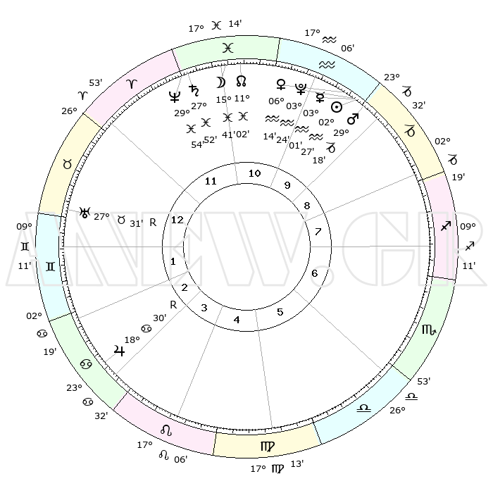 | | ΘΕΣΕΙΣ ΠΛΑΝΗΤΩΝ ΑΣΤΡΟΛΟΓΙΚΟΥ ΧΑΡΤΗ ΤΗΣ ΣΤΙΓΜΗΣ ΑΥΤΗΣ | | | | Πλανήτης | Ζώδιο | Μοίρες | Δεκαήμ. | Σε οίκο | Απόκλιση | | Ακμές των οίκων | | Ηλιος | Υδροχόος | 02°23' | Πρώτο | 10 | 19 S 37 | | 1ος | 08°04' | Ταύρος | | Σελήνη | Ιχθείς | 14°46' | Δεύτερο | 11 | 05 S 33 | | 2ος | 08°06' | Δίδυμοι | | Ερμής | Υδροχόος | 02°54' | Πρώτο | 10 | 21 S 31 | | 3ος | 00°54' | Καρκίνος | | Αφροδίτη | Υδροχόος | 06°09' | Πρώτο | 10 | 19 S 52 | | 4ος | 22°40' | Καρκίνος | | Αρης | Αιγόκερως | 29°15' | Τρίτο | 10 | 21 S 17 | | 5ος | 17°57' | Λέων | | Δίας | Καρκίνος | 18°30'R | Δεύτερο | 3 | 22 N 26 | | 6ος | 22°16' | Παρθένος | | Κρόνος | Ιχθείς | 27°52' | Τρίτο | 12 | 02 S 52 | | 7ος | 08°04' | Σκορπιός | | Ουρανός | Ταύρος | 27°32'R | Τρίτο | 1 | 19 N 25 | | 8ος | 08°06' | Τοξότης | | Ποσειδώνας | Ιχθείς | 29°54' | Τρίτο | 12 | 01 S 15 | | 9ος | 00°54' | Αιγόκερως | | Πλούτωνας | Υδροχόος | 03°24' | Πρώτο | 10 | 23 S 05 | | 10ος | 22°40' | Αιγόκερως | | Β. Δεσμός | Ιχθείς | 11°02' | Δεύτερο | 11 | 07 S 26 | | 11ος | 17°57' | Υδροχόος | | Ωροσκόπος | Ταύρος | 08°04' | Πρώτο | | | 12ος | 22°16' | Ιχθείς | | Μεσουράνημα | Αιγόκερως | 22°40' | Τρίτο | | | |