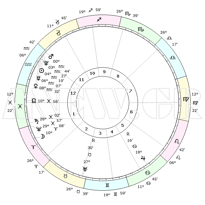 | | ΘΕΣΕΙΣ ΠΛΑΝΗΤΩΝ ΑΣΤΡΟΛΟΓΙΚΟΥ ΧΑΡΤΗ ΤΗΣ ΣΤΙΓΜΗΣ ΑΥΤΗΣ | | | | Πλανήτης | Ζώδιο | Μοίρες | Δεκαήμ. | Σε οίκο | Απόκλιση | | Ακμές των οίκων | | Ηλιος | Υδροχόος | 04°14' | Πρώτο | 1 | 19 S 12 | | 1ος | 00°49' | Υδροχόος | | Σελήνη | Κριός | 09°01' | Πρώτο | 2 | 05 N 57 | | 2ος | 15°03' | Ιχθείς | | Ερμής | Υδροχόος | 05°59' | Πρώτο | 1 | 20 S 48 | | 3ος | 23°22' | Κριός | | Αφροδίτη | Υδροχόος | 08°26' | Πρώτο | 1 | 19 S 20 | | 4ος | 21°41' | Ταύρος | | Αρης | Υδροχόος | 00°40' | Πρώτο | 12 | 20 S 59 | | 5ος | 14°23' | Δίδυμοι | | Δίας | Καρκίνος | 18°17'R | Δεύτερο | 6 | 22 N 28 | | 6ος | 05°50' | Καρκίνος | | Κρόνος | Ιχθείς | 28°01' | Τρίτο | 2 | 02 S 48 | | 7ος | 00°49' | Λέων | | Ουρανός | Ταύρος | 27°30'R | Τρίτο | 4 | 19 N 25 | | 8ος | 15°03' | Παρθένος | | Ποσειδώνας | Ιχθείς | 29°56' | Τρίτο | 2 | 01 S 14 | | 9ος | 23°22' | Ζυγός | | Πλούτωνας | Υδροχόος | 03°27' | Πρώτο | 1 | 23 S 04 | | 10ος | 21°41' | Σκορπιός | | Β. Δεσμός | Ιχθείς | 10°56' | Δεύτερο | 1 | 07 S 28 | | 11ος | 14°23' | Τοξότης | | Ωροσκόπος | Υδροχόος | 00°49' | Πρώτο | | | 12ος | 05°50' | Αιγόκερως | | Μεσουράνημα | Σκορπιός | 21°41' | Τρίτο | | | |
