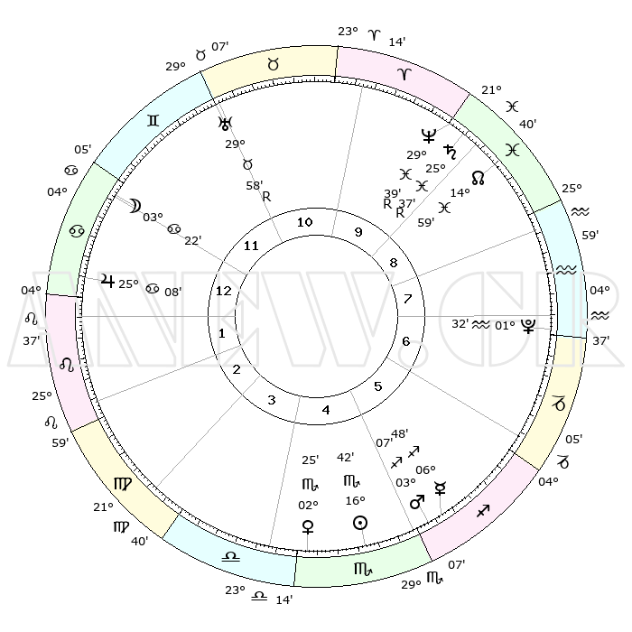| | ΘΕΣΕΙΣ ΠΛΑΝΗΤΩΝ ΑΣΤΡΟΛΟΓΙΚΟΥ ΧΑΡΤΗ ΤΗΣ ΣΤΙΓΜΗΣ ΑΥΤΗΣ | | | | Πλανήτης | Ζώδιο | Μοίρες | Δεκαήμ. | Σε οίκο | Απόκλιση | | Ακμές των οίκων | | Ηλιος | Σκορπιός | 16°37' | Δεύτερο | 5 | 16 S 48 | | 1ος | 12°43' | Καρκίνος | | Σελήνη | Καρκίνος | 02°17' | Πρώτο | 12 | 28 N 18 | | 2ος | 03°08' | Λέων | | Ερμής | Τοξότης | 06°47' | Πρώτο | 5 | 23 S 54 | | 3ος | 26°02' | Λέων | | Αφροδίτη | Σκορπιός | 02°19' | Πρώτο | 5 | 11 S 00 | | 4ος | 24°28' | Παρθένος | | Αρης | Τοξότης | 03°03' | Πρώτο | 5 | 21 S 13 | | 5ος | 00°00' | Σκορπιός | | Δίας | Καρκίνος | 25°08' | Τρίτο | 1 | 21 N 12 | | 6ος | 08°34' | Τοξότης | | Κρόνος | Ιχθείς | 25°37'R | Τρίτο | 10 | 03 S 59 | | 7ος | 12°43' | Αιγόκερως | | Ουρανός | Ταύρος | 29°58'R | Τρίτο | 11 | 19 N 56 | | 8ος | 03°08' | Υδροχόος | | Ποσειδώνας | Ιχθείς | 29°39'R | Τρίτο | 10 | 01 S 24 | | 9ος | 26°02' | Υδροχόος | | Πλούτωνας | Υδροχόος | 01°32' | Πρώτο | 7 | 23 S 29 | | 10ος | 24°28' | Ιχθείς | | Β. Δεσμός | Ιχθείς | 14°59' | Δεύτερο | 9 | 05 S 55 | | 11ος | 00°00' | Ταύρος | | Ωροσκόπος | Καρκίνος | 12°43' | Δεύτερο | | | 12ος | 08°34' | Δίδυμοι | | Μεσουράνημα | Ιχθείς | 24°28' | Τρίτο | | | |