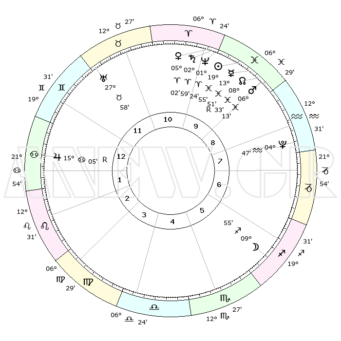 | | ΘΕΣΕΙΣ ΠΛΑΝΗΤΩΝ ΑΣΤΡΟΛΟΓΙΚΟΥ ΧΑΡΤΗ ΤΗΣ ΣΤΙΓΜΗΣ ΑΥΤΗΣ | | | | Πλανήτης | Ζώδιο | Μοίρες | Δεκαήμ. | Σε οίκο | Απόκλιση | | Ακμές των οίκων | | Ηλιος | Ιχθείς | 19°52' | Δεύτερο | 10 | 04 S 01 | | 1ος | 06°08' | Καρκίνος | | Σελήνη | Τοξότης | 09°18' | Πρώτο | 6 | 27 S 03 | | 2ος | 26°38' | Καρκίνος | | Ερμής | Ιχθείς | 13°54'R | Δεύτερο | 9 | 03 S 16 | | 3ος | 18°54' | Λέων | | Αφροδίτη | Κριός | 04°58' | Πρώτο | 10 | 00 N 54 | | 4ος | 16°13' | Παρθένος | | Αρης | Ιχθείς | 06°11' | Πρώτο | 9 | 10 S 15 | | 5ος | 21°03' | Ζυγός | | Δίας | Καρκίνος | 15°05'R | Δεύτερο | 1 | 22 N 56 | | 6ος | 00°29' | Τοξότης | | Κρόνος | Κριός | 02°59' | Πρώτο | 10 | 00 S 46 | | 7ος | 06°08' | Αιγόκερως | | Ουρανός | Ταύρος | 27°58' | Τρίτο | 11 | 19 N 32 | | 8ος | 26°38' | Αιγόκερως | | Ποσειδώνας | Κριός | 01°24' | Πρώτο | 10 | 00 S 39 | | 9ος | 18°54' | Υδροχόος | | Πλούτωνας | Υδροχόος | 04°47' | Πρώτο | 8 | 22 S 50 | | 10ος | 16°13' | Ιχθείς | | Β. Δεσμός | Ιχθείς | 08°33' | Πρώτο | 9 | 08 S 22 | | 11ος | 21°03' | Κριός | | Ωροσκόπος | Καρκίνος | 06°08' | Πρώτο | | | 12ος | 00°29' | Δίδυμοι | | Μεσουράνημα | Ιχθείς | 16°13' | Δεύτερο | | | |