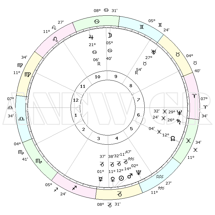 | | ΘΕΣΕΙΣ ΠΛΑΝΗΤΩΝ ΑΣΤΡΟΛΟΓΙΚΟΥ ΧΑΡΤΗ ΤΗΣ ΣΤΙΓΜΗΣ ΑΥΤΗΣ | | | | Πλανήτης | Ζώδιο | Μοίρες | Δεκαήμ. | Σε οίκο | Απόκλιση | | Ακμές των οίκων | | Ηλιος | Αιγόκερως | 12°28' | Δεύτερο | 4 | 22 S 51 | | 1ος | 16°29' | Παρθένος | | Σελήνη | Καρκίνος | 04°35' | Πρώτο | 10 | 27 N 59 | | 2ος | 11°59' | Ζυγός | | Ερμής | Αιγόκερως | 01°30' | Πρώτο | 4 | 24 S 12 | | 3ος | 11°49' | Σκορπιός | | Αφροδίτη | Αιγόκερως | 11°33' | Δεύτερο | 4 | 23 S 30 | | 4ος | 14°45' | Τοξότης | | Αρης | Αιγόκερως | 14°07' | Δεύτερο | 4 | 23 S 35 | | 5ος | 18°03' | Αιγόκερως | | Δίας | Καρκίνος | 21°07'R | Τρίτο | 11 | 22 N 01 | | 6ος | 19°01' | Υδροχόος | | Κρόνος | Ιχθείς | 26°24' | Τρίτο | 7 | 03 S 30 | | 7ος | 16°29' | Ιχθείς | | Ουρανός | Ταύρος | 27°54'R | Τρίτο | 9 | 19 N 30 | | 8ος | 11°59' | Κριός | | Ποσειδώνας | Ιχθείς | 29°32' | Τρίτο | 7 | 01 S 24 | | 9ος | 11°49' | Ταύρος | | Πλούτωνας | Υδροχόος | 02°47' | Πρώτο | 5 | 23 S 12 | | 10ος | 14°45' | Δίδυμοι | | Β. Δεσμός | Ιχθείς | 12°04' | Δεύτερο | 6 | 07 S 02 | | 11ος | 18°03' | Καρκίνος | | Ωροσκόπος | Παρθένος | 16°29' | Δεύτερο | | | 12ος | 19°01' | Λέων | | Μεσουράνημα | Δίδυμοι | 14°45' | Δεύτερο | | | |