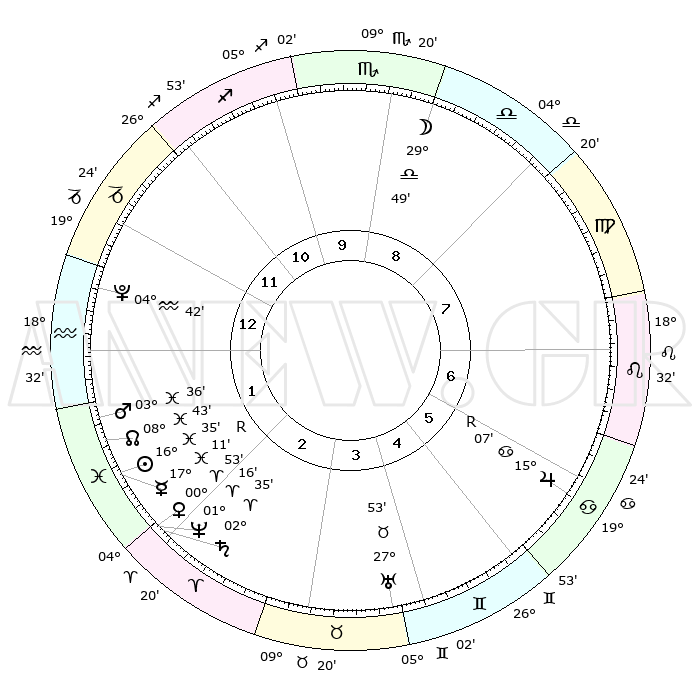 | | ΘΕΣΕΙΣ ΠΛΑΝΗΤΩΝ ΑΣΤΡΟΛΟΓΙΚΟΥ ΧΑΡΤΗ ΤΗΣ ΣΤΙΓΜΗΣ ΑΥΤΗΣ | | | | Πλανήτης | Ζώδιο | Μοίρες | Δεκαήμ. | Σε οίκο | Απόκλιση | | Ακμές των οίκων | | Ηλιος | Ιχθείς | 16°29' | Δεύτερο | 2 | 05 S 20 | | 1ος | 06°06' | Αιγόκερως | | Σελήνη | Ζυγός | 28°33' | Τρίτο | 10 | 14 S 42 | | 2ος | 14°48' | Υδροχόος | | Ερμής | Ιχθείς | 17°18'R | Δεύτερο | 2 | 01 S 39 | | 3ος | 25°05' | Ιχθείς | | Αφροδίτη | Κριός | 00°45' | Πρώτο | 3 | 00 S 51 | | 4ος | 27°59' | Κριός | | Αρης | Ιχθείς | 03°31' | Πρώτο | 2 | 11 S 14 | | 5ος | 23°22' | Ταύρος | | Δίας | Καρκίνος | 15°07'R | Δεύτερο | 7 | 22 N 56 | | 6ος | 14°50' | Δίδυμοι | | Κρόνος | Κριός | 02°34' | Πρώτο | 3 | 00 S 56 | | 7ος | 06°06' | Καρκίνος | | Ουρανός | Ταύρος | 27°53' | Τρίτο | 5 | 19 N 30 | | 8ος | 14°48' | Λέων | | Ποσειδώνας | Κριός | 01°16' | Πρώτο | 3 | 00 S 42 | | 9ος | 25°05' | Παρθένος | | Πλούτωνας | Υδροχόος | 04°42' | Πρώτο | 1 | 22 S 51 | | 10ος | 27°59' | Ζυγός | | Β. Δεσμός | Ιχθείς | 08°44' | Πρώτο | 2 | 08 S 18 | | 11ος | 23°22' | Σκορπιός | | Ωροσκόπος | Αιγόκερως | 06°06' | Πρώτο | | | 12ος | 14°50' | Τοξότης | | Μεσουράνημα | Ζυγός | 27°59' | Τρίτο | | | |