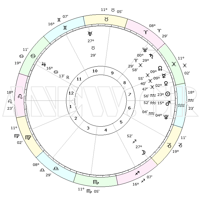| | ΘΕΣΕΙΣ ΠΛΑΝΗΤΩΝ ΑΣΤΡΟΛΟΓΙΚΟΥ ΧΑΡΤΗ ΤΗΣ ΣΤΙΓΜΗΣ ΑΥΤΗΣ | | | | Πλανήτης | Ζώδιο | Μοίρες | Δεκαήμ. | Σε οίκο | Απόκλιση | | Ακμές των οίκων | | Ηλιος | Υδροχόος | 23°48' | Τρίτο | 9 | 13 S 35 | | 1ος | 10°40' | Καρκίνος | | Σελήνη | Τοξότης | 26°19' | Τρίτο | 6 | 28 S 24 | | 2ος | 01°06' | Λέων | | Ερμής | Ιχθείς | 09°28' | Πρώτο | 9 | 08 S 27 | | 3ος | 23°47' | Λέων | | Αφροδίτη | Ιχθείς | 02°38' | Πρώτο | 9 | 11 S 54 | | 4ος | 21°52' | Παρθένος | | Αρης | Υδροχόος | 15°46' | Δεύτερο | 8 | 17 S 08 | | 5ος | 27°13' | Ζυγός | | Δίας | Καρκίνος | 16°13'R | Δεύτερο | 1 | 22 N 46 | | 6ος | 06°04' | Τοξότης | | Κρόνος | Ιχθείς | 29°57' | Τρίτο | 10 | 02 S 00 | | 7ος | 10°40' | Αιγόκερως | | Ουρανός | Ταύρος | 27°29' | Τρίτο | 11 | 19 N 25 | | 8ος | 01°06' | Υδροχόος | | Ποσειδώνας | Κριός | 00°29' | Πρώτο | 10 | 01 S 01 | | 9ος | 23°47' | Υδροχόος | | Πλούτωνας | Υδροχόος | 04°04' | Πρώτο | 8 | 22 S 57 | | 10ος | 21°52' | Ιχθείς | | Β. Δεσμός | Ιχθείς | 09°55' | Πρώτο | 9 | 07 S 51 | | 11ος | 27°13' | Κριός | | Ωροσκόπος | Καρκίνος | 10°40' | Δεύτερο | | | 12ος | 06°04' | Δίδυμοι | | Μεσουράνημα | Ιχθείς | 21°52' | Τρίτο | | | |