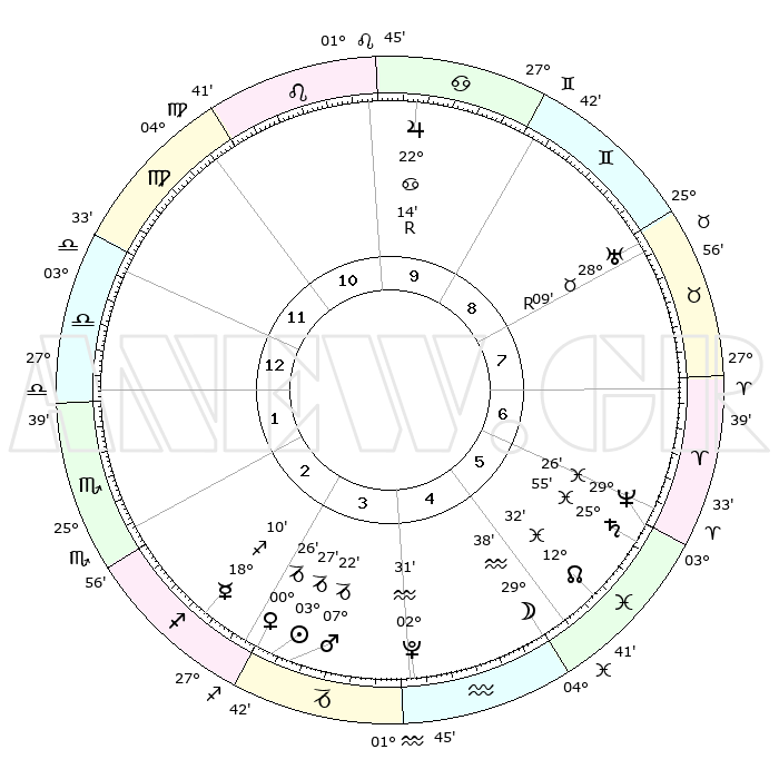 | | ΘΕΣΕΙΣ ΠΛΑΝΗΤΩΝ ΑΣΤΡΟΛΟΓΙΚΟΥ ΧΑΡΤΗ ΤΗΣ ΣΤΙΓΜΗΣ ΑΥΤΗΣ | | | | Πλανήτης | Ζώδιο | Μοίρες | Δεκαήμ. | Σε οίκο | Απόκλιση | | Ακμές των οίκων | | Ηλιος | Αιγόκερως | 03°21' | Πρώτο | 4 | 23 S 23 | | 1ος | 27°40' | Παρθένος | | Σελήνη | Υδροχόος | 28°19' | Τρίτο | 5 | 13 S 07 | | 2ος | 24°05' | Ζυγός | | Ερμής | Τοξότης | 18°01' | Δεύτερο | 3 | 22 S 38 | | 3ος | 24°25' | Σκορπιός | | Αφροδίτη | Αιγόκερως | 00°18' | Πρώτο | 4 | 23 S 40 | | 4ος | 27°23' | Τοξότης | | Αρης | Αιγόκερως | 07°17' | Πρώτο | 4 | 24 S 05 | | 5ος | 00°23' | Υδροχόος | | Δίας | Καρκίνος | 22°15'R | Τρίτο | 10 | 21 N 49 | | 6ος | 00°54' | Ιχθείς | | Κρόνος | Ιχθείς | 25°55' | Τρίτο | 6 | 03 S 43 | | 7ος | 27°40' | Ιχθείς | | Ουρανός | Ταύρος | 28°09'R | Τρίτο | 9 | 19 N 33 | | 8ος | 24°05' | Κριός | | Ποσειδώνας | Ιχθείς | 29°26' | Τρίτο | 7 | 01 S 27 | | 9ος | 24°25' | Ταύρος | | Πλούτωνας | Υδροχόος | 02°31' | Πρώτο | 5 | 23 S 16 | | 10ος | 27°23' | Δίδυμοι | | Β. Δεσμός | Ιχθείς | 12°33' | Δεύτερο | 6 | 06 S 51 | | 11ος | 00°23' | Λέων | | Ωροσκόπος | Παρθένος | 27°40' | Τρίτο | | | 12ος | 00°54' | Παρθένος | | Μεσουράνημα | Δίδυμοι | 27°23' | Τρίτο | | | |