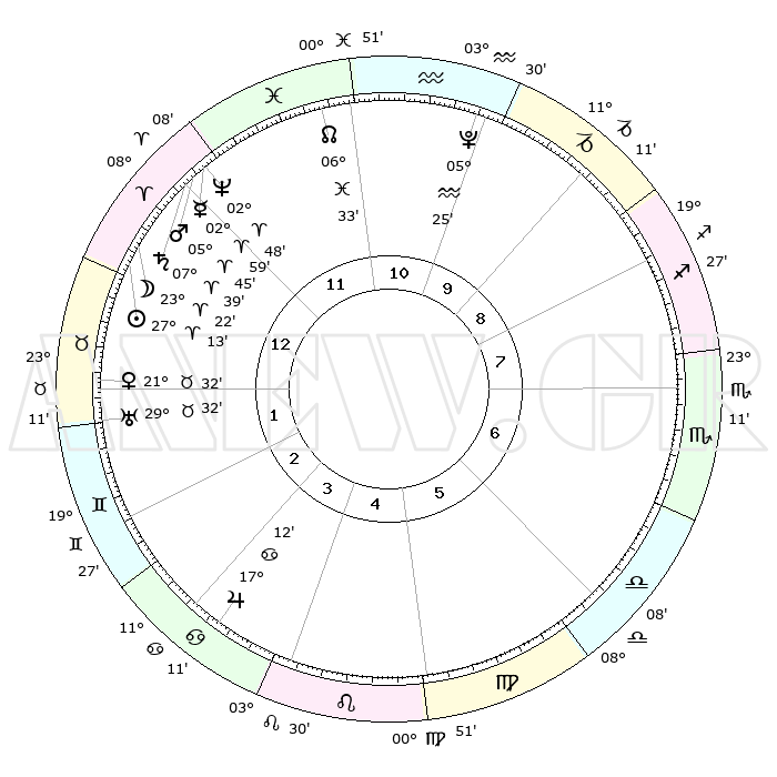 | | ΘΕΣΕΙΣ ΠΛΑΝΗΤΩΝ ΑΣΤΡΟΛΟΓΙΚΟΥ ΧΑΡΤΗ ΤΗΣ ΣΤΙΓΜΗΣ ΑΥΤΗΣ | | | | Πλανήτης | Ζώδιο | Μοίρες | Δεκαήμ. | Σε οίκο | Απόκλιση | | Ακμές των οίκων | | Ηλιος | Κριός | 27°10' | Τρίτο | 12 | 10 N 28 | | 1ος | 01°15' | Ταύρος | | Σελήνη | Κριός | 22°43' | Τρίτο | 12 | 12 N 11 | | 2ος | 03°07' | Δίδυμοι | | Ερμής | Κριός | 02°55' | Πρώτο | 12 | 01 S 15 | | 3ος | 26°33' | Δίδυμοι | | Αφροδίτη | Ταύρος | 21°29' | Τρίτο | 1 | 18 N 23 | | 4ος | 18°15' | Καρκίνος | | Αρης | Κριός | 05°43' | Πρώτο | 12 | 01 N 23 | | 5ος | 12°46' | Λέων | | Δίας | Καρκίνος | 17°12' | Δεύτερο | 3 | 22 N 42 | | 6ος | 15°44' | Παρθένος | | Κρόνος | Κριός | 07°39' | Πρώτο | 12 | 01 N 04 | | 7ος | 01°15' | Σκορπιός | | Ουρανός | Ταύρος | 29°32' | Τρίτο | 1 | 19 N 53 | | 8ος | 03°07' | Τοξότης | | Ποσειδώνας | Κριός | 02°48' | Πρώτο | 12 | 00 S 06 | | 9ος | 26°33' | Τοξότης | | Πλούτωνας | Υδροχόος | 05°25' | Πρώτο | 10 | 22 S 47 | | 10ος | 18°15' | Αιγόκερως | | Β. Δεσμός | Ιχθείς | 06°33' | Πρώτο | 11 | 09 S 06 | | 11ος | 12°46' | Υδροχόος | | Ωροσκόπος | Ταύρος | 01°15' | Πρώτο | | | 12ος | 15°44' | Ιχθείς | | Μεσουράνημα | Αιγόκερως | 18°15' | Δεύτερο | | | |