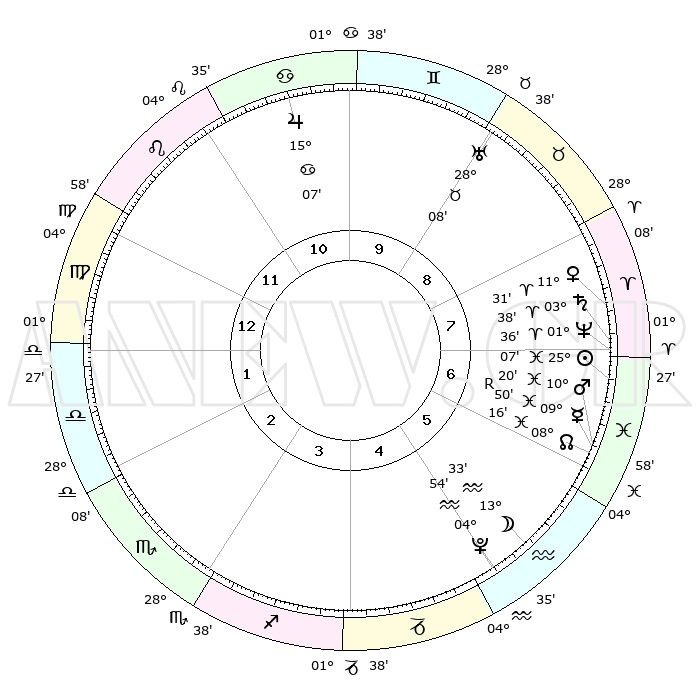 | | ΘΕΣΕΙΣ ΠΛΑΝΗΤΩΝ ΑΣΤΡΟΛΟΓΙΚΟΥ ΧΑΡΤΗ ΤΗΣ ΣΤΙΓΜΗΣ ΑΥΤΗΣ | | | | Πλανήτης | Ζώδιο | Μοίρες | Δεκαήμ. | Σε οίκο | Απόκλιση | | Ακμές των οίκων | | Ηλιος | Ιχθείς | 25°04' | Τρίτο | 7 | 01 S 58 | | 1ος | 12°26' | Παρθένος | | Σελήνη | Υδροχόος | 12°44' | Δεύτερο | 5 | 19 S 14 | | 2ος | 07°32' | Ζυγός | | Ερμής | Ιχθείς | 09°52'R | Πρώτο | 6 | 05 S 46 | | 3ος | 07°09' | Σκορπιός | | Αφροδίτη | Κριός | 11°26' | Δεύτερο | 8 | 03 N 35 | | 4ος | 10°05' | Τοξότης | | Αρης | Ιχθείς | 10°17' | Δεύτερο | 6 | 08 S 43 | | 5ος | 13°34' | Αιγόκερως | | Δίας | Καρκίνος | 15°07' | Δεύτερο | 11 | 22 N 56 | | 6ος | 14°44' | Υδροχόος | | Κρόνος | Κριός | 03°37' | Πρώτο | 7 | 00 S 31 | | 7ος | 12°26' | Ιχθείς | | Ουρανός | Ταύρος | 28°08' | Τρίτο | 9 | 19 N 34 | | 8ος | 07°32' | Κριός | | Ποσειδώνας | Κριός | 01°35' | Πρώτο | 7 | 00 S 34 | | 9ος | 07°09' | Ταύρος | | Πλούτωνας | Υδροχόος | 04°54' | Πρώτο | 5 | 22 S 49 | | 10ος | 10°05' | Δίδυμοι | | Β. Δεσμός | Ιχθείς | 08°16' | Πρώτο | 6 | 08 S 28 | | 11ος | 13°34' | Καρκίνος | | Ωροσκόπος | Παρθένος | 12°26' | Δεύτερο | | | 12ος | 14°44' | Λέων | | Μεσουράνημα | Δίδυμοι | 10°05' | Δεύτερο | | | |