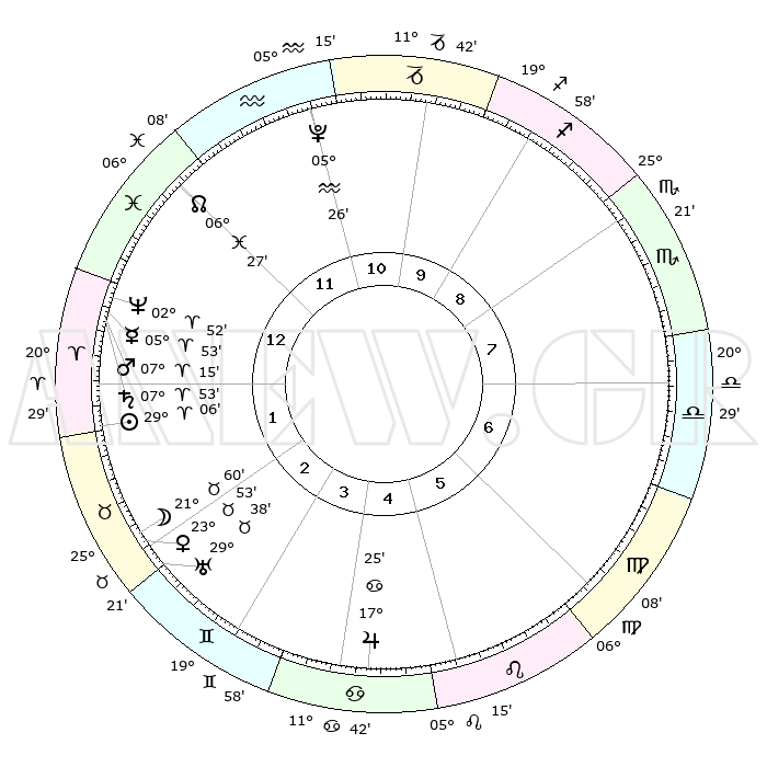 | | ΘΕΣΕΙΣ ΠΛΑΝΗΤΩΝ ΑΣΤΡΟΛΟΓΙΚΟΥ ΧΑΡΤΗ ΤΗΣ ΣΤΙΓΜΗΣ ΑΥΤΗΣ | | | | Πλανήτης | Ζώδιο | Μοίρες | Δεκαήμ. | Σε οίκο | Απόκλιση | | Ακμές των οίκων | | Ηλιος | Κριός | 29°02' | Τρίτο | 2 | 11 N 08 | | 1ος | 08°30' | Ιχθείς | | Σελήνη | Ταύρος | 20°55' | Τρίτο | 2 | 22 N 41 | | 2ος | 22°60' | Κριός | | Ερμής | Κριός | 05°46' | Πρώτο | 1 | 00 S 08 | | 3ος | 24°04' | Ταύρος | | Αφροδίτη | Ταύρος | 23°48' | Τρίτο | 2 | 19 N 04 | | 4ος | 17°43' | Δίδυμοι | | Αρης | Κριός | 07°12' | Πρώτο | 1 | 01 N 58 | | 5ος | 09°25' | Καρκίνος | | Δίας | Καρκίνος | 17°24' | Δεύτερο | 5 | 22 N 41 | | 6ος | 03°55' | Λέων | | Κρόνος | Κριός | 07°52' | Πρώτο | 1 | 01 N 09 | | 7ος | 08°30' | Παρθένος | | Ουρανός | Ταύρος | 29°38' | Τρίτο | 3 | 19 N 54 | | 8ος | 22°60' | Ζυγός | | Ποσειδώνας | Κριός | 02°52' | Πρώτο | 1 | 00 S 04 | | 9ος | 24°04' | Σκορπιός | | Πλούτωνας | Υδροχόος | 05°26' | Πρώτο | 12 | 22 S 47 | | 10ος | 17°43' | Τοξότης | | Β. Δεσμός | Ιχθείς | 06°27' | Πρώτο | 12 | 09 S 09 | | 11ος | 09°26' | Αιγόκερως | | Ωροσκόπος | Ιχθείς | 08°30' | Πρώτο | | | 12ος | 03°55' | Υδροχόος | | Μεσουράνημα | Τοξότης | 17°43' | Δεύτερο | | | |