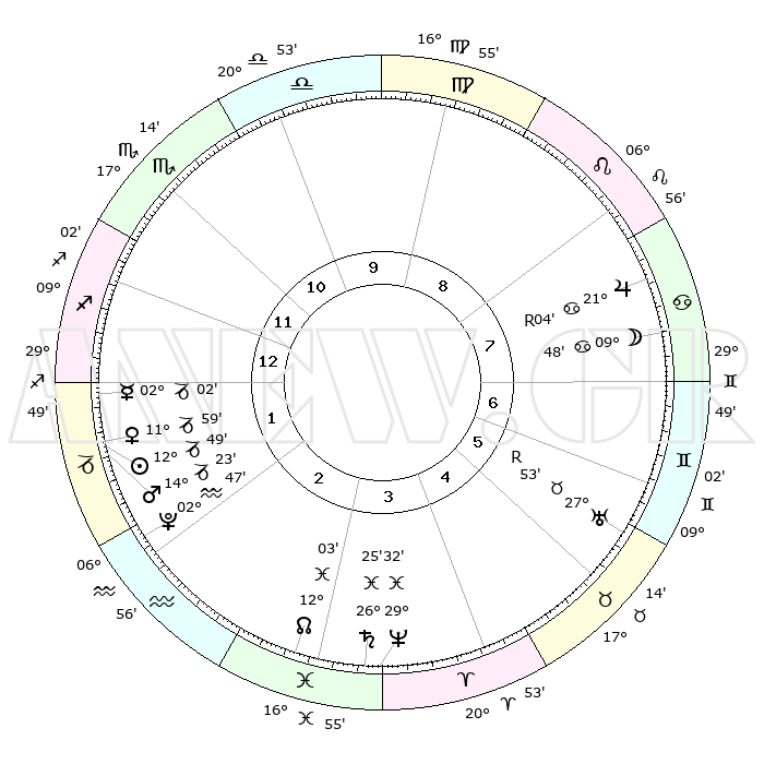 | | ΘΕΣΕΙΣ ΠΛΑΝΗΤΩΝ ΑΣΤΡΟΛΟΓΙΚΟΥ ΧΑΡΤΗ ΤΗΣ ΣΤΙΓΜΗΣ ΑΥΤΗΣ | | | | Πλανήτης | Ζώδιο | Μοίρες | Δεκαήμ. | Σε οίκο | Απόκλιση | | Ακμές των οίκων | | Ηλιος | Αιγόκερως | 12°39' | Δεύτερο | 2 | 22 S 50 | | 1ος | 12°39' | Σκορπιός | | Σελήνη | Καρκίνος | 07°28' | Πρώτο | 8 | 27 N 45 | | 2ος | 11°56' | Τοξότης | | Ερμής | Αιγόκερως | 01°48' | Πρώτο | 2 | 24 S 13 | | 3ος | 15°08' | Αιγόκερως | | Αφροδίτη | Αιγόκερως | 11°48' | Δεύτερο | 2 | 23 S 29 | | 4ος | 20°14' | Υδροχόος | | Αρης | Αιγόκερως | 14°16' | Δεύτερο | 2 | 23 S 34 | | 5ος | 22°47' | Ιχθείς | | Δίας | Καρκίνος | 21°05'R | Τρίτο | 9 | 22 N 01 | | 6ος | 20°07' | Κριός | | Κρόνος | Ιχθείς | 26°24' | Τρίτο | 5 | 03 S 30 | | 7ος | 12°39' | Ταύρος | | Ουρανός | Ταύρος | 27°53'R | Τρίτο | 7 | 19 N 30 | | 8ος | 11°56' | Δίδυμοι | | Ποσειδώνας | Ιχθείς | 29°32' | Τρίτο | 5 | 01 S 24 | | 9ος | 15°08' | Καρκίνος | | Πλούτωνας | Υδροχόος | 02°47' | Πρώτο | 3 | 23 S 12 | | 10ος | 20°14' | Λέων | | Β. Δεσμός | Ιχθείς | 12°04' | Δεύτερο | 4 | 07 S 02 | | 11ος | 22°47' | Παρθένος | | Ωροσκόπος | Σκορπιός | 12°39' | Δεύτερο | | | 12ος | 20°07' | Ζυγός | | Μεσουράνημα | Λέων | 20°14' | Τρίτο | | | |