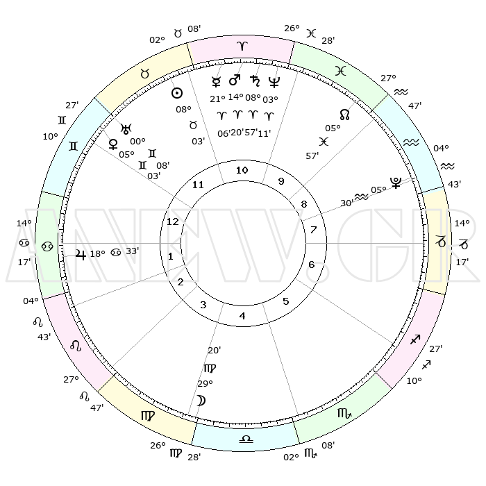 | | ΘΕΣΕΙΣ ΠΛΑΝΗΤΩΝ ΑΣΤΡΟΛΟΓΙΚΟΥ ΧΑΡΤΗ ΤΗΣ ΣΤΙΓΜΗΣ ΑΥΤΗΣ | | | | Πλανήτης | Ζώδιο | Μοίρες | Δεκαήμ. | Σε οίκο | Απόκλιση | | Ακμές των οίκων | | Ηλιος | Ταύρος | 07°59' | Πρώτο | 11 | 14 N 10 | | 1ος | 21°55' | Δίδυμοι | | Σελήνη | Παρθένος | 28°28' | Τρίτο | 4 | 01 S 05 | | 2ος | 13°21' | Καρκίνος | | Ερμής | Κριός | 20°59' | Τρίτο | 11 | 06 N 09 | | 3ος | 04°45' | Λέων | | Αφροδίτη | Δίδυμοι | 04°58' | Πρώτο | 12 | 21 N 53 | | 4ος | 29°51' | Λέων | | Αρης | Κριός | 14°17' | Δεύτερο | 11 | 04 N 48 | | 5ος | 02°23' | Ζυγός | | Δίας | Καρκίνος | 18°33' | Δεύτερο | 2 | 22 N 32 | | 6ος | 12°41' | Σκορπιός | | Κρόνος | Κριός | 08°57' | Πρώτο | 11 | 01 N 33 | | 7ος | 21°55' | Τοξότης | | Ουρανός | Δίδυμοι | 00°08' | Πρώτο | 12 | 20 N 01 | | 8ος | 13°21' | Αιγόκερως | | Ποσειδώνας | Κριός | 03°11' | Πρώτο | 11 | 00 N 03 | | 9ος | 04°45' | Υδροχόος | | Πλούτωνας | Υδροχόος | 05°30' | Πρώτο | 9 | 22 S 48 | | 10ος | 29°51' | Υδροχόος | | Β. Δεσμός | Ιχθείς | 05°58' | Πρώτο | 10 | 09 S 19 | | 11ος | 02°23' | Κριός | | Ωροσκόπος | Δίδυμοι | 21°55' | Τρίτο | | | 12ος | 12°41' | Ταύρος | | Μεσουράνημα | Υδροχόος | 29°51' | Τρίτο | | | |