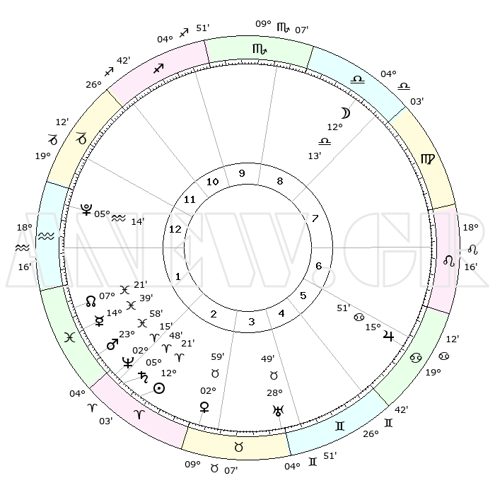 | | ΘΕΣΕΙΣ ΠΛΑΝΗΤΩΝ ΑΣΤΡΟΛΟΓΙΚΟΥ ΧΑΡΤΗ ΤΗΣ ΣΤΙΓΜΗΣ ΑΥΤΗΣ | | | | Πλανήτης | Ζώδιο | Μοίρες | Δεκαήμ. | Σε οίκο | Απόκλιση | | Ακμές των οίκων | | Ηλιος | Κριός | 12°17' | Δεύτερο | 2 | 04 N 51 | | 1ος | 20°25' | Αιγόκερως | | Σελήνη | Ζυγός | 11°25' | Δεύτερο | 8 | 07 S 06 | | 2ος | 02°38' | Ιχθείς | | Ερμής | Ιχθείς | 14°35' | Δεύτερο | 2 | 07 S 25 | | 3ος | 12°20' | Κριός | | Αφροδίτη | Ταύρος | 02°54' | Πρώτο | 3 | 12 N 06 | | 4ος | 12°32' | Ταύρος | | Αρης | Ιχθείς | 23°55' | Τρίτο | 2 | 03 S 22 | | 5ος | 06°08' | Δίδυμοι | | Δίας | Καρκίνος | 15°51' | Δεύτερο | 6 | 22 N 52 | | 6ος | 27°21' | Δίδυμοι | | Κρόνος | Κριός | 05°47' | Πρώτο | 2 | 00 N 21 | | 7ος | 20°25' | Καρκίνος | | Ουρανός | Ταύρος | 28°48' | Τρίτο | 4 | 19 N 43 | | 8ος | 02°38' | Παρθένος | | Ποσειδώνας | Κριός | 02°15' | Πρώτο | 2 | 00 S 18 | | 9ος | 12°19' | Ζυγός | | Πλούτωνας | Υδροχόος | 05°14' | Πρώτο | 1 | 22 S 47 | | 10ος | 12°32' | Σκορπιός | | Β. Δεσμός | Ιχθείς | 07°21' | Πρώτο | 2 | 08 S 49 | | 11ος | 06°08' | Τοξότης | | Ωροσκόπος | Αιγόκερως | 20°25' | Τρίτο | | | 12ος | 27°21' | Τοξότης | | Μεσουράνημα | Σκορπιός | 12°32' | Δεύτερο | | | |