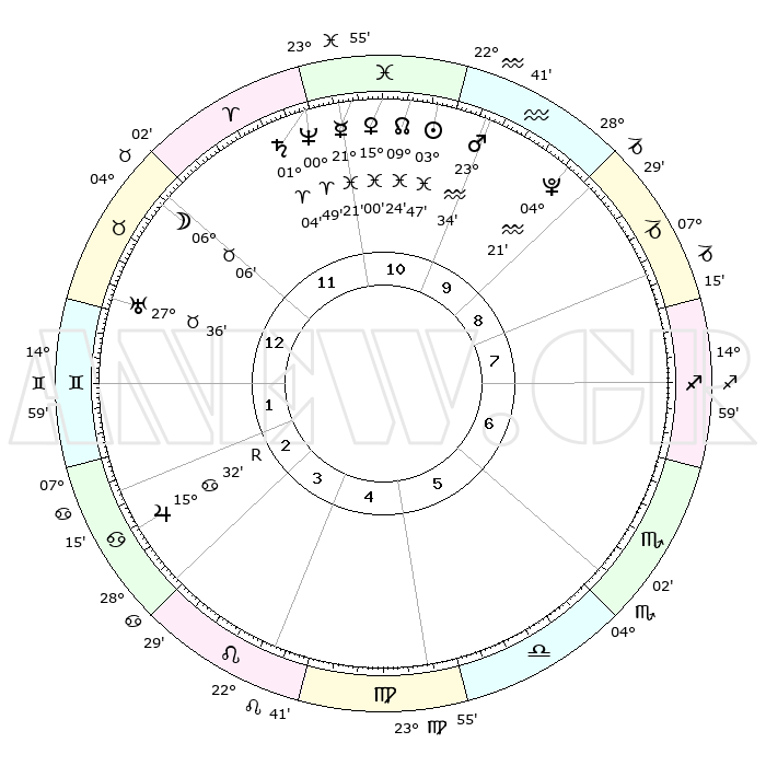 | | ΘΕΣΕΙΣ ΠΛΑΝΗΤΩΝ ΑΣΤΡΟΛΟΓΙΚΟΥ ΧΑΡΤΗ ΤΗΣ ΣΤΙΓΜΗΣ ΑΥΤΗΣ | | | | Πλανήτης | Ζώδιο | Μοίρες | Δεκαήμ. | Σε οίκο | Απόκλιση | | Ακμές των οίκων | | Ηλιος | Ιχθείς | 03°43' | Πρώτο | 11 | 10 S 09 | | 1ος | 13°15' | Ταύρος | | Σελήνη | Ταύρος | 05°03' | Πρώτο | 12 | 17 N 20 | | 2ος | 11°56' | Δίδυμοι | | Ερμής | Ιχθείς | 21°18' | Τρίτο | 11 | 01 S 45 | | 3ος | 04°18' | Καρκίνος | | Αφροδίτη | Ιχθείς | 14°55' | Δεύτερο | 11 | 07 S 16 | | 4ος | 26°12' | Καρκίνος | | Αρης | Υδροχόος | 23°30' | Τρίτο | 11 | 14 S 43 | | 5ος | 22°07' | Λέων | | Δίας | Καρκίνος | 15°33'R | Δεύτερο | 3 | 22 N 52 | | 6ος | 27°30' | Παρθένος | | Κρόνος | Κριός | 01°03' | Πρώτο | 12 | 01 S 33 | | 7ος | 13°15' | Σκορπιός | | Ουρανός | Ταύρος | 27°36' | Τρίτο | 1 | 19 N 27 | | 8ος | 11°56' | Τοξότης | | Ποσειδώνας | Κριός | 00°49' | Πρώτο | 12 | 00 S 53 | | 9ος | 04°18' | Αιγόκερως | | Πλούτωνας | Υδροχόος | 04°21' | Πρώτο | 10 | 22 S 54 | | 10ος | 26°12' | Αιγόκερως | | Β. Δεσμός | Ιχθείς | 09°24' | Πρώτο | 11 | 08 S 03 | | 11ος | 22°07' | Υδροχόος | | Ωροσκόπος | Ταύρος | 13°15' | Δεύτερο | | | 12ος | 27°30' | Ιχθείς | | Μεσουράνημα | Αιγόκερως | 26°12' | Τρίτο | | | |