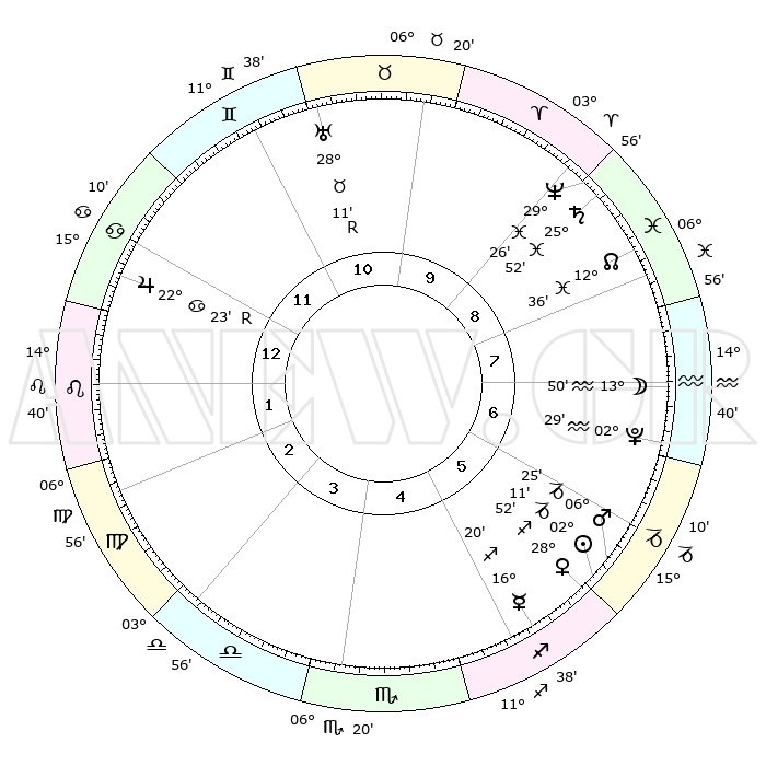 | | ΘΕΣΕΙΣ ΠΛΑΝΗΤΩΝ ΑΣΤΡΟΛΟΓΙΚΟΥ ΧΑΡΤΗ ΤΗΣ ΣΤΙΓΜΗΣ ΑΥΤΗΣ | | | | Πλανήτης | Ζώδιο | Μοίρες | Δεκαήμ. | Σε οίκο | Απόκλιση | | Ακμές των οίκων | | Ηλιος | Αιγόκερως | 02°07' | Πρώτο | 6 | 23 S 25 | | 1ος | 22°47' | Καρκίνος | | Σελήνη | Υδροχόος | 12°54' | Δεύτερο | 7 | 19 S 15 | | 2ος | 13°25' | Λέων | | Ερμής | Τοξότης | 16°13' | Δεύτερο | 5 | 22 S 18 | | 3ος | 07°31' | Παρθένος | | Αφροδίτη | Τοξότης | 28°46' | Τρίτο | 6 | 23 S 37 | | 4ος | 07°33' | Ζυγός | | Αρης | Αιγόκερως | 06°21' | Πρώτο | 6 | 24 S 07 | | 5ος | 13°37' | Σκορπιός | | Δίας | Καρκίνος | 22°24'R | Τρίτο | 12 | 21 N 47 | | 6ος | 20°33' | Τοξότης | | Κρόνος | Ιχθείς | 25°51' | Τρίτο | 9 | 03 S 45 | | 7ος | 22°47' | Αιγόκερως | | Ουρανός | Ταύρος | 28°12'R | Τρίτο | 11 | 19 N 33 | | 8ος | 13°25' | Υδροχόος | | Ποσειδώνας | Ιχθείς | 29°25' | Τρίτο | 9 | 01 S 27 | | 9ος | 07°31' | Ιχθείς | | Πλούτωνας | Υδροχόος | 02°29' | Πρώτο | 7 | 23 S 16 | | 10ος | 07°33' | Κριός | | Β. Δεσμός | Ιχθείς | 12°37' | Δεύτερο | 9 | 06 S 50 | | 11ος | 13°37' | Ταύρος | | Ωροσκόπος | Καρκίνος | 22°47' | Τρίτο | | | 12ος | 20°33' | Δίδυμοι | | Μεσουράνημα | Κριός | 07°33' | Πρώτο | | | |