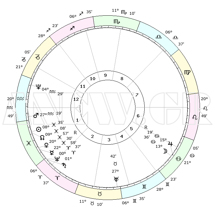 | | ΘΕΣΕΙΣ ΠΛΑΝΗΤΩΝ ΑΣΤΡΟΛΟΓΙΚΟΥ ΧΑΡΤΗ ΤΗΣ ΣΤΙΓΜΗΣ ΑΥΤΗΣ | | | | Πλανήτης | Ζώδιο | Μοίρες | Δεκαήμ. | Σε οίκο | Απόκλιση | | Ακμές των οίκων | | Ηλιος | Ιχθείς | 08°31' | Πρώτο | 2 | 08 S 23 | | 1ος | 21°19' | Αιγόκερως | | Σελήνη | Καρκίνος | 12°40' | Δεύτερο | 6 | 27 N 12 | | 2ος | 03°44' | Ιχθείς | | Ερμής | Ιχθείς | 22°30'R | Τρίτο | 2 | 00 S 15 | | 3ος | 13°20' | Κριός | | Αφροδίτη | Ιχθείς | 20°52' | Τρίτο | 2 | 04 S 53 | | 4ος | 13°22' | Ταύρος | | Αρης | Υδροχόος | 27°16' | Τρίτο | 1 | 13 S 27 | | 5ος | 06°53' | Δίδυμοι | | Δίας | Καρκίνος | 15°19'R | Δεύτερο | 6 | 22 N 54 | | 6ος | 28°06' | Δίδυμοι | | Κρόνος | Κριός | 01°37' | Πρώτο | 2 | 01 S 19 | | 7ος | 21°19' | Καρκίνος | | Ουρανός | Ταύρος | 27°42' | Τρίτο | 4 | 19 N 28 | | 8ος | 03°44' | Παρθένος | | Ποσειδώνας | Κριός | 00°59' | Πρώτο | 2 | 00 S 49 | | 9ος | 13°20' | Ζυγός | | Πλούτωνας | Υδροχόος | 04°29' | Πρώτο | 1 | 22 S 53 | | 10ος | 13°22' | Σκορπιός | | Β. Δεσμός | Ιχθείς | 09°09' | Πρώτο | 2 | 08 S 08 | | 11ος | 06°53' | Τοξότης | | Ωροσκόπος | Αιγόκερως | 21°19' | Τρίτο | | | 12ος | 28°06' | Τοξότης | | Μεσουράνημα | Σκορπιός | 13°22' | Δεύτερο | | | |