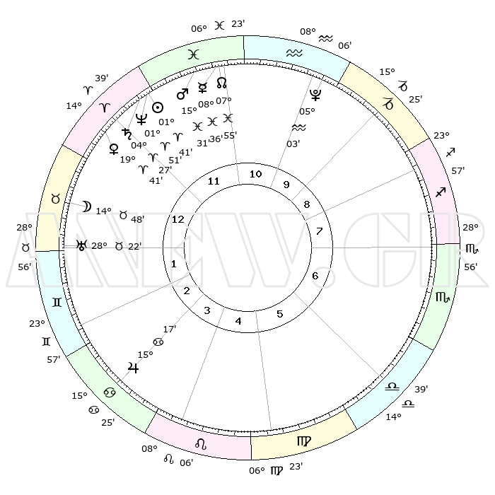 | | ΘΕΣΕΙΣ ΠΛΑΝΗΤΩΝ ΑΣΤΡΟΛΟΓΙΚΟΥ ΧΑΡΤΗ ΤΗΣ ΣΤΙΓΜΗΣ ΑΥΤΗΣ | | | | Πλανήτης | Ζώδιο | Μοίρες | Δεκαήμ. | Σε οίκο | Απόκλιση | | Ακμές των οίκων | | Ηλιος | Κριός | 01°36' | Πρώτο | 12 | 00 N 38 | | 1ος | 22°01' | Κριός | | Σελήνη | Ταύρος | 13°43' | Δεύτερο | 1 | 20 N 29 | | 2ος | 26°28' | Ταύρος | | Ερμής | Ιχθείς | 08°36' | Πρώτο | 12 | 07 S 45 | | 3ος | 20°53' | Δίδυμοι | | Αφροδίτη | Κριός | 19°35' | Δεύτερο | 12 | 06 N 54 | | 4ος | 12°36' | Καρκίνος | | Αρης | Ιχθείς | 15°28' | Δεύτερο | 12 | 06 S 43 | | 5ος | 06°17' | Λέων | | Δίας | Καρκίνος | 15°17' | Δεύτερο | 4 | 22 N 55 | | 6ος | 07°27' | Παρθένος | | Κρόνος | Κριός | 04°27' | Πρώτο | 12 | 00 S 11 | | 7ος | 22°01' | Ζυγός | | Ουρανός | Ταύρος | 28°22' | Τρίτο | 2 | 19 N 37 | | 8ος | 26°28' | Σκορπιός | | Ποσειδώνας | Κριός | 01°50' | Πρώτο | 12 | 00 S 28 | | 9ος | 20°53' | Τοξότης | | Πλούτωνας | Υδροχόος | 05°02' | Πρώτο | 10 | 22 S 48 | | 10ος | 12°36' | Αιγόκερως | | Β. Δεσμός | Ιχθείς | 07°55' | Πρώτο | 12 | 08 S 36 | | 11ος | 06°17' | Υδροχόος | | Ωροσκόπος | Κριός | 22°01' | Τρίτο | | | 12ος | 07°27' | Ιχθείς | | Μεσουράνημα | Αιγόκερως | 12°36' | Δεύτερο | | | |