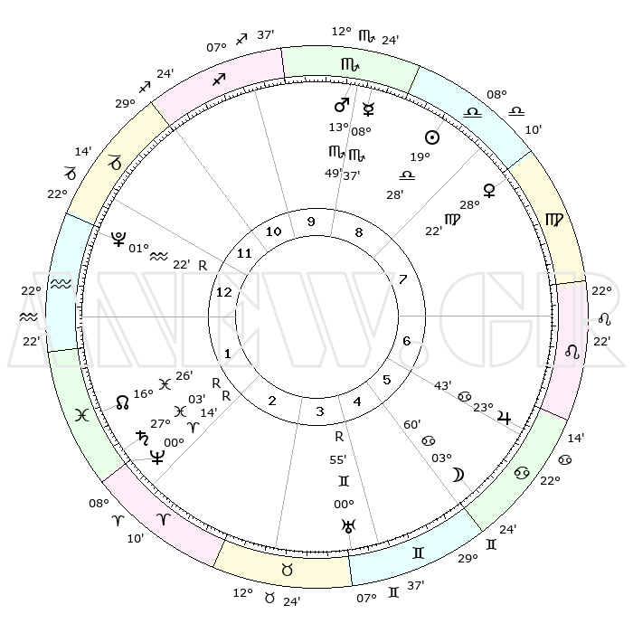| ΘΕΣΕΙΣ ΠΛΑΝΗΤΩΝ ΑΣΤΡΟΛΟΓΙΚΟΥ ΧΑΡΤΗ ΤΗΣ ΣΤΙΓΜΗΣ ΑΥΤΗΣ | | Πλανήτης | Ζώδιο | Μοίρες | Δεκαήμ. | Σε οίκο | Απόκλιση | | Ακμές των οίκων | Ηλιος | Ζυγός | 19°23' | Δεύτερο | 9 | 07 S 35 | | 1ος | 11°59' | Αιγόκερως | Σελήνη | Καρκίνος | 02°40' | Πρώτο | 6 | 28 N 27 | | 2ος | 22°12' | Υδροχόος | Ερμής | Σκορπιός | 08°29' | Πρώτο | 10 | 15 S 42 | | 3ος | 02°27' | Κριός | Αφροδίτη | Παρθένος | 28°15' | Τρίτο | 8 | 02 N 04 | | 4ος | 04°15' | Ταύρος | Αρης | Σκορπιός | 13°45' | Δεύτερο | 10 | 16 S 09 | | 5ος | 28°50' | Ταύρος | Δίας | Καρκίνος | 23°42' | Τρίτο | 7 | 21 N 24 | | 6ος | 20°06' | Δίδυμοι | Κρόνος | Ιχθείς | 27°03'R | Τρίτο | 2 | 03 S 28 | | 7ος | 11°59' | Καρκίνος | Ουρανός | Δίδυμοι | 00°56'R | Πρώτο | 5 | 20 N 08 | | 8ος | 22°12' | Λέων | Ποσειδώνας | Κριός | 00°14'R | Πρώτο | 2 | 01 S 10 | | 9ος | 02°27' | Ζυγός | Πλούτωνας | Υδροχόος | 01°22'R | Πρώτο | 1 | 23 S 32 | | 10ος | 04°15' | Σκορπιός | Β. Δεσμός | Ιχθείς | 16°26' | Δεύτερο | 2 | 05 S 21 | | 11ος | 28°50' | Σκορπιός | Ωροσκόπος | Αιγόκερως | 11°59' | Δεύτερο | | | 12ος | 20°06' | Τοξότης | Μεσουράνημα | Σκορπιός | 04°15' | Πρώτο | | | |