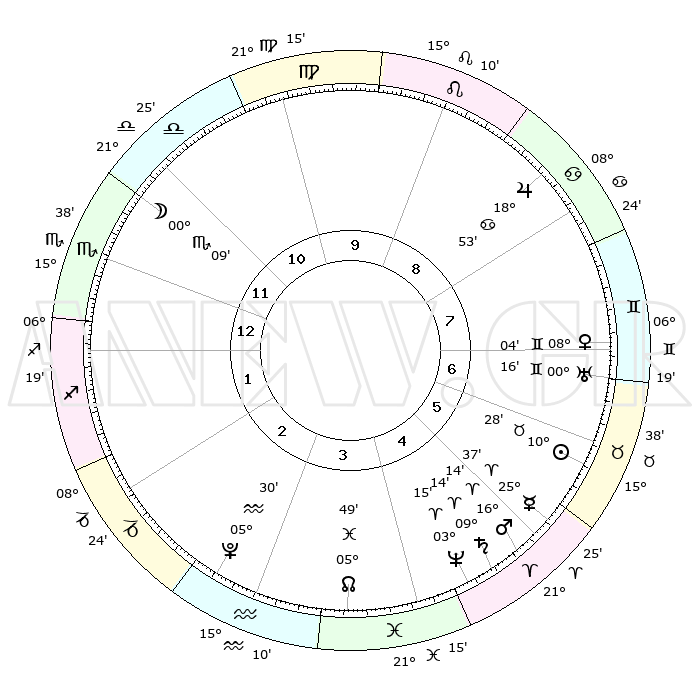 | | ΘΕΣΕΙΣ ΠΛΑΝΗΤΩΝ ΑΣΤΡΟΛΟΓΙΚΟΥ ΧΑΡΤΗ ΤΗΣ ΣΤΙΓΜΗΣ ΑΥΤΗΣ | | | | Πλανήτης | Ζώδιο | Μοίρες | Δεκαήμ. | Σε οίκο | Απόκλιση | | Ακμές των οίκων | | Ηλιος | Ταύρος | 10°24' | Δεύτερο | 6 | 14 N 56 | | 1ος | 20°17' | Σκορπιός | | Σελήνη | Ζυγός | 29°29' | Τρίτο | 12 | 15 S 02 | | 2ος | 20°15' | Τοξότης | | Ερμής | Κριός | 25°31' | Τρίτο | 5 | 08 N 03 | | 3ος | 24°27' | Αιγόκερως | | Αφροδίτη | Δίδυμοι | 07°60' | Πρώτο | 7 | 22 N 31 | | 4ος | 00°04' | Ιχθείς | | Αρης | Κριός | 16°11' | Δεύτερο | 5 | 05 N 33 | | 5ος | 02°07' | Κριός | | Δίας | Καρκίνος | 18°53' | Δεύτερο | 8 | 22 N 29 | | 6ος | 28°28' | Κριός | | Κρόνος | Κριός | 09°14' | Πρώτο | 5 | 01 N 40 | | 7ος | 20°17' | Ταύρος | | Ουρανός | Δίδυμοι | 00°16' | Πρώτο | 7 | 20 N 02 | | 8ος | 20°15' | Δίδυμοι | | Ποσειδώνας | Κριός | 03°15' | Πρώτο | 5 | 00 N 05 | | 9ος | 24°27' | Καρκίνος | | Πλούτωνας | Υδροχόος | 05°30' | Πρώτο | 3 | 22 S 49 | | 10ος | 00°04' | Παρθένος | | Β. Δεσμός | Ιχθείς | 05°50' | Πρώτο | 4 | 09 S 22 | | 11ος | 02°07' | Ζυγός | | Ωροσκόπος | Σκορπιός | 20°17' | Τρίτο | | | 12ος | 28°28' | Ζυγός | | Μεσουράνημα | Παρθένος | 00°04' | Πρώτο | | | |