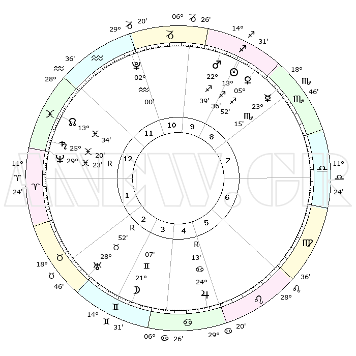 | | ΘΕΣΕΙΣ ΠΛΑΝΗΤΩΝ ΑΣΤΡΟΛΟΓΙΚΟΥ ΧΑΡΤΗ ΤΗΣ ΣΤΙΓΜΗΣ ΑΥΤΗΣ | | | | Πλανήτης | Ζώδιο | Μοίρες | Δεκαήμ. | Σε οίκο | Απόκλιση | | Ακμές των οίκων | | Ηλιος | Τοξότης | 13°33' | Δεύτερο | 9 | 22 S 25 | | 1ος | 16°56' | Ιχθείς | | Σελήνη | Δίδυμοι | 20°29' | Τρίτο | 3 | 28 N 02 | | 2ος | 00°03' | Ταύρος | | Ερμής | Σκορπιός | 23°13' | Τρίτο | 8 | 16 S 08 | | 3ος | 29°36' | Ταύρος | | Αφροδίτη | Τοξότης | 05°49' | Πρώτο | 9 | 20 S 44 | | 4ος | 22°37' | Δίδυμοι | | Αρης | Τοξότης | 22°37' | Τρίτο | 10 | 23 S 56 | | 5ος | 14°28' | Καρκίνος | | Δίας | Καρκίνος | 24°13'R | Τρίτο | 5 | 21 N 26 | | 6ος | 10°01' | Λέων | | Κρόνος | Ιχθείς | 25°20' | Τρίτο | 1 | 04 S 01 | | 7ος | 16°56' | Παρθένος | | Ουρανός | Ταύρος | 28°52'R | Τρίτο | 2 | 19 N 42 | | 8ος | 00°03' | Σκορπιός | | Ποσειδώνας | Ιχθείς | 29°23'R | Τρίτο | 1 | 01 S 29 | | 9ος | 29°36' | Σκορπιός | | Πλούτωνας | Υδροχόος | 02°00' | Πρώτο | 11 | 23 S 23 | | 10ος | 22°37' | Τοξότης | | Β. Δεσμός | Ιχθείς | 13°34' | Δεύτερο | 12 | 06 S 27 | | 11ος | 14°29' | Αιγόκερως | | Ωροσκόπος | Ιχθείς | 16°56' | Δεύτερο | | | 12ος | 10°01' | Υδροχόος | | Μεσουράνημα | Τοξότης | 22°37' | Τρίτο | | | |