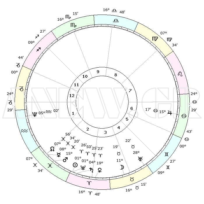 | | ΘΕΣΕΙΣ ΠΛΑΝΗΤΩΝ ΑΣΤΡΟΛΟΓΙΚΟΥ ΧΑΡΤΗ ΤΗΣ ΣΤΙΓΜΗΣ ΑΥΤΗΣ | | | | Πλανήτης | Ζώδιο | Μοίρες | Δεκαήμ. | Σε οίκο | Απόκλιση | | Ακμές των οίκων | | Ηλιος | Κριός | 01°22' | Πρώτο | 3 | 00 N 33 | | 1ος | 26°48' | Τοξότης | | Σελήνη | Ταύρος | 10°12' | Δεύτερο | 4 | 19 N 14 | | 2ος | 03°09' | Υδροχόος | | Ερμής | Ιχθείς | 08°34' | Πρώτο | 2 | 07 S 42 | | 3ος | 12°53' | Ιχθείς | | Αφροδίτη | Κριός | 19°17' | Δεύτερο | 4 | 06 N 47 | | 4ος | 17°18' | Κριός | | Αρης | Ιχθείς | 15°16' | Δεύτερο | 3 | 06 S 48 | | 5ος | 14°08' | Ταύρος | | Δίας | Καρκίνος | 15°17' | Δεύτερο | 7 | 22 N 55 | | 6ος | 06°10' | Δίδυμοι | | Κρόνος | Κριός | 04°25' | Πρώτο | 3 | 00 S 12 | | 7ος | 26°48' | Δίδυμοι | | Ουρανός | Ταύρος | 28°21' | Τρίτο | 5 | 19 N 37 | | 8ος | 03°09' | Λέων | | Ποσειδώνας | Κριός | 01°50' | Πρώτο | 3 | 00 S 28 | | 9ος | 12°53' | Παρθένος | | Πλούτωνας | Υδροχόος | 05°02' | Πρώτο | 2 | 22 S 48 | | 10ος | 17°18' | Ζυγός | | Β. Δεσμός | Ιχθείς | 07°56' | Πρώτο | 2 | 08 S 36 | | 11ος | 14°08' | Σκορπιός | | Ωροσκόπος | Τοξότης | 26°48' | Τρίτο | | | 12ος | 06°10' | Τοξότης | | Μεσουράνημα | Ζυγός | 17°18' | Δεύτερο | | | |
