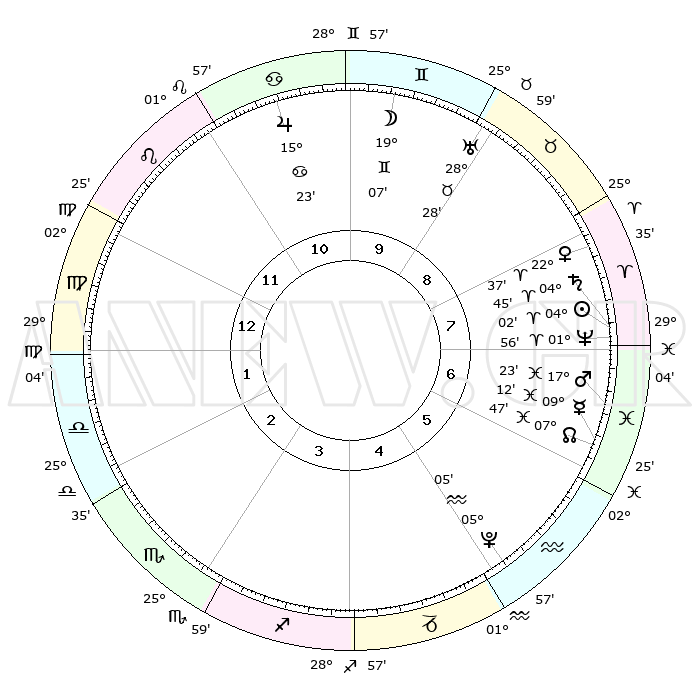 | | ΘΕΣΕΙΣ ΠΛΑΝΗΤΩΝ ΑΣΤΡΟΛΟΓΙΚΟΥ ΧΑΡΤΗ ΤΗΣ ΣΤΙΓΜΗΣ ΑΥΤΗΣ | | | | Πλανήτης | Ζώδιο | Μοίρες | Δεκαήμ. | Σε οίκο | Απόκλιση | | Ακμές των οίκων | | Ηλιος | Κριός | 03°58' | Πρώτο | 7 | 01 N 35 | | 1ος | 10°28' | Παρθένος | | Σελήνη | Δίδυμοι | 18°12' | Δεύτερο | 10 | 28 N 03 | | 2ος | 05°23' | Ζυγός | | Ερμής | Ιχθείς | 09°10' | Πρώτο | 6 | 08 S 02 | | 3ος | 04°52' | Σκορπιός | | Αφροδίτη | Κριός | 22°32' | Τρίτο | 8 | 08 N 05 | | 4ος | 07°49' | Τοξότης | | Αρης | Ιχθείς | 17°20' | Δεύτερο | 7 | 05 S 59 | | 5ος | 11°24' | Αιγόκερως | | Δίας | Καρκίνος | 15°23' | Δεύτερο | 11 | 22 N 55 | | 6ος | 12°40' | Υδροχόος | | Κρόνος | Κριός | 04°44' | Πρώτο | 7 | 00 S 04 | | 7ος | 10°28' | Ιχθείς | | Ουρανός | Ταύρος | 28°27' | Τρίτο | 9 | 19 N 39 | | 8ος | 05°23' | Κριός | | Ποσειδώνας | Κριός | 01°56' | Πρώτο | 7 | 00 S 26 | | 9ος | 04°52' | Ταύρος | | Πλούτωνας | Υδροχόος | 05°05' | Πρώτο | 5 | 22 S 48 | | 10ος | 07°50' | Δίδυμοι | | Β. Δεσμός | Ιχθείς | 07°48' | Πρώτο | 6 | 08 S 39 | | 11ος | 11°24' | Καρκίνος | | Ωροσκόπος | Παρθένος | 10°28' | Δεύτερο | | | 12ος | 12°40' | Λέων | | Μεσουράνημα | Δίδυμοι | 07°50' | Πρώτο | | | |