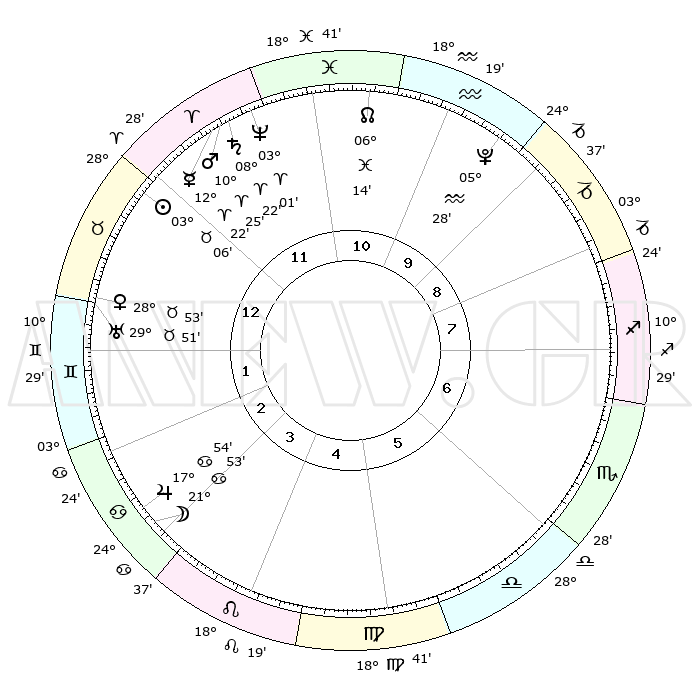 | | ΘΕΣΕΙΣ ΠΛΑΝΗΤΩΝ ΑΣΤΡΟΛΟΓΙΚΟΥ ΧΑΡΤΗ ΤΗΣ ΣΤΙΓΜΗΣ ΑΥΤΗΣ | | | | Πλανήτης | Ζώδιο | Μοίρες | Δεκαήμ. | Σε οίκο | Απόκλιση | | Ακμές των οίκων | | Ηλιος | Ταύρος | 03°03' | Πρώτο | 12 | 12 N 31 | | 1ος | 15°15' | Ταύρος | | Σελήνη | Καρκίνος | 21°04' | Τρίτο | 3 | 25 N 26 | | 2ος | 13°25' | Δίδυμοι | | Ερμής | Κριός | 12°16' | Δεύτερο | 12 | 02 N 31 | | 3ος | 05°39' | Καρκίνος | | Αφροδίτη | Ταύρος | 28°48' | Τρίτο | 1 | 20 N 25 | | 4ος | 27°37' | Καρκίνος | | Αρης | Κριός | 10°22' | Δεύτερο | 12 | 03 N 15 | | 5ος | 23°48' | Λέων | | Δίας | Καρκίνος | 17°53' | Δεύτερο | 3 | 22 N 37 | | 6ος | 29°34' | Παρθένος | | Κρόνος | Κριός | 08°22' | Πρώτο | 12 | 01 N 20 | | 7ος | 15°15' | Σκορπιός | | Ουρανός | Ταύρος | 29°51' | Τρίτο | 1 | 19 N 57 | | 8ος | 13°25' | Τοξότης | | Ποσειδώνας | Κριός | 03°00' | Πρώτο | 12 | 00 S 01 | | 9ος | 05°39' | Αιγόκερως | | Πλούτωνας | Υδροχόος | 05°28' | Πρώτο | 10 | 22 S 48 | | 10ος | 27°37' | Αιγόκερως | | Β. Δεσμός | Ιχθείς | 06°14' | Πρώτο | 11 | 09 S 13 | | 11ος | 23°48' | Υδροχόος | | Ωροσκόπος | Ταύρος | 15°15' | Δεύτερο | | | 12ος | 29°34' | Ιχθείς | | Μεσουράνημα | Αιγόκερως | 27°37' | Τρίτο | | | |