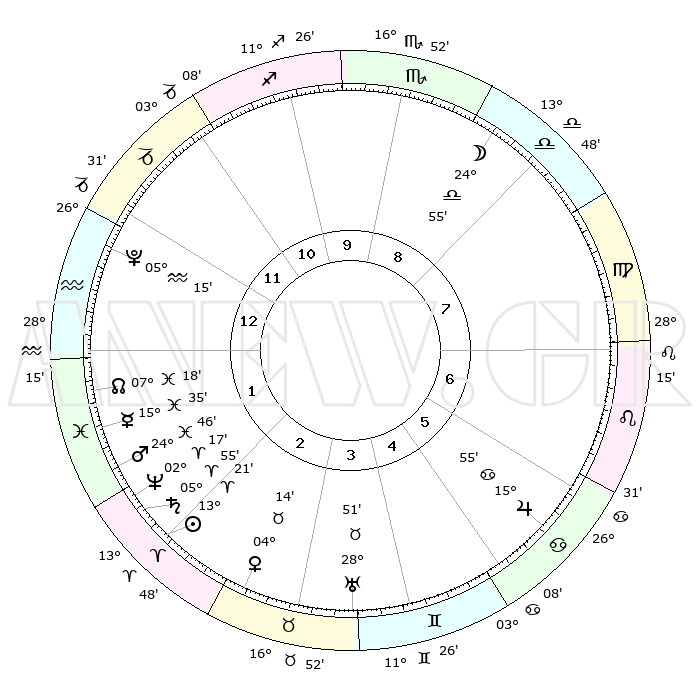 | | ΘΕΣΕΙΣ ΠΛΑΝΗΤΩΝ ΑΣΤΡΟΛΟΓΙΚΟΥ ΧΑΡΤΗ ΤΗΣ ΣΤΙΓΜΗΣ ΑΥΤΗΣ | | | | Πλανήτης | Ζώδιο | Μοίρες | Δεκαήμ. | Σε οίκο | Απόκλιση | | Ακμές των οίκων | | Ηλιος | Κριός | 13°17' | Δεύτερο | 2 | 05 N 15 | | 1ος | 27°23' | Αιγόκερως | | Σελήνη | Ζυγός | 24°07' | Τρίτο | 9 | 12 S 47 | | 2ος | 11°02' | Ιχθείς | | Ερμής | Ιχθείς | 15°31' | Δεύτερο | 2 | 07 S 11 | | 3ος | 19°52' | Κριός | | Αφροδίτη | Ταύρος | 04°09' | Πρώτο | 3 | 12 N 34 | | 4ος | 18°47' | Ταύρος | | Αρης | Ιχθείς | 24°43' | Τρίτο | 2 | 03 S 03 | | 5ος | 11°45' | Δίδυμοι | | Δίας | Καρκίνος | 15°55' | Δεύτερο | 6 | 22 N 51 | | 6ος | 03°05' | Καρκίνος | | Κρόνος | Κριός | 05°55' | Πρώτο | 2 | 00 N 23 | | 7ος | 27°23' | Καρκίνος | | Ουρανός | Ταύρος | 28°51' | Τρίτο | 4 | 19 N 44 | | 8ος | 11°02' | Παρθένος | | Ποσειδώνας | Κριός | 02°17' | Πρώτο | 2 | 00 S 18 | | 9ος | 19°52' | Ζυγός | | Πλούτωνας | Υδροχόος | 05°15' | Πρώτο | 1 | 22 S 47 | | 10ος | 18°47' | Σκορπιός | | Β. Δεσμός | Ιχθείς | 07°18' | Πρώτο | 1 | 08 S 50 | | 11ος | 11°45' | Τοξότης | | Ωροσκόπος | Αιγόκερως | 27°23' | Τρίτο | | | 12ος | 03°05' | Αιγόκερως | | Μεσουράνημα | Σκορπιός | 18°47' | Δεύτερο | | | |
