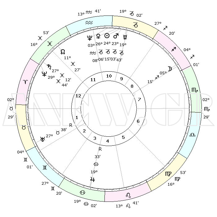 | | ΘΕΣΕΙΣ ΠΛΑΝΗΤΩΝ ΑΣΤΡΟΛΟΓΙΚΟΥ ΧΑΡΤΗ ΤΗΣ ΣΤΙΓΜΗΣ ΑΥΤΗΣ | | | | Πλανήτης | Ζώδιο | Μοίρες | Δεκαήμ. | Σε οίκο | Απόκλιση | | Ακμές των οίκων | | Ηλιος | Αιγόκερως | 24°11' | Τρίτο | 11 | 21 S 16 | | 1ος | 25°10' | Ιχθείς | | Σελήνη | Τοξότης | 04°29' | Πρώτο | 8 | 26 S 02 | | 2ος | 06°35' | Ταύρος | | Ερμής | Αιγόκερως | 19°36' | Δεύτερο | 11 | 23 S 44 | | 3ος | 04°45' | Δίδυμοι | | Αφροδίτη | Αιγόκερως | 26°01' | Τρίτο | 11 | 21 S 53 | | 4ος | 27°17' | Δίδυμοι | | Αρης | Αιγόκερως | 22°60' | Τρίτο | 11 | 22 S 26 | | 5ος | 19°24' | Καρκίνος | | Δίας | Καρκίνος | 19°34'R | Δεύτερο | 5 | 22 N 16 | | 6ος | 16°04' | Λέων | | Κρόνος | Ιχθείς | 27°12' | Τρίτο | 1 | 03 S 09 | | 7ος | 25°10' | Παρθένος | | Ουρανός | Ταύρος | 27°38'R | Τρίτο | 2 | 19 N 26 | | 8ος | 06°35' | Σκορπιός | | Ποσειδώνας | Ιχθείς | 29°43' | Τρίτο | 1 | 01 S 20 | | 9ος | 04°45' | Τοξότης | | Πλούτωνας | Υδροχόος | 03°08' | Πρώτο | 11 | 23 S 08 | | 10ος | 27°17' | Τοξότης | | Β. Δεσμός | Ιχθείς | 11°28' | Δεύτερο | 12 | 07 S 16 | | 11ος | 19°24' | Αιγόκερως | | Ωροσκόπος | Ιχθείς | 25°10' | Τρίτο | | | 12ος | 16°04' | Υδροχόος | | Μεσουράνημα | Τοξότης | 27°17' | Τρίτο | | | |