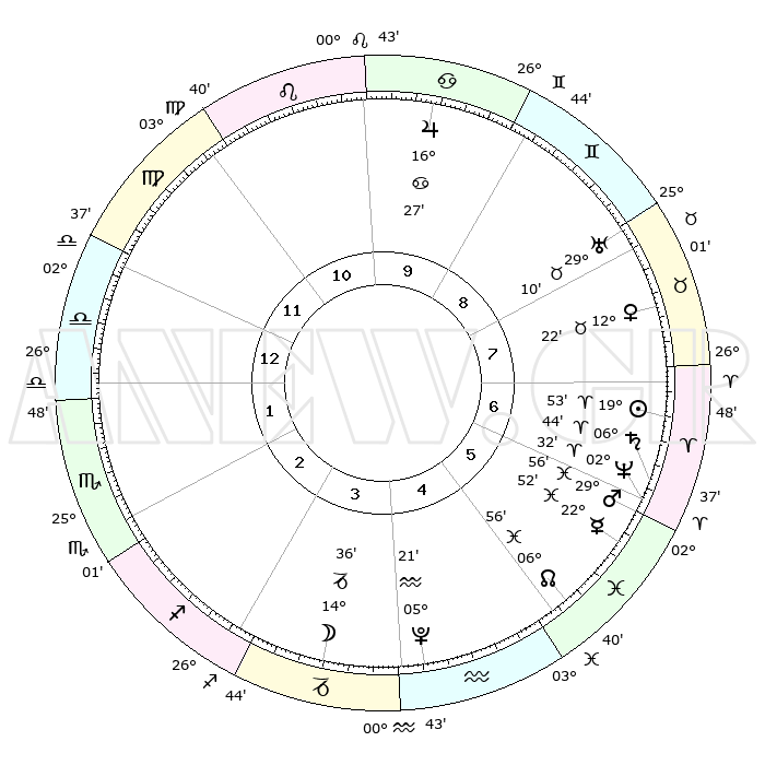 | | ΘΕΣΕΙΣ ΠΛΑΝΗΤΩΝ ΑΣΤΡΟΛΟΓΙΚΟΥ ΧΑΡΤΗ ΤΗΣ ΣΤΙΓΜΗΣ ΑΥΤΗΣ | | | | Πλανήτης | Ζώδιο | Μοίρες | Δεκαήμ. | Σε οίκο | Απόκλιση | | Ακμές των οίκων | | Ηλιος | Κριός | 19°48' | Δεύτερο | 7 | 07 N 45 | | 1ος | 05°24' | Ζυγός | | Σελήνη | Αιγόκερως | 13°43' | Δεύτερο | 4 | 26 S 54 | | 2ος | 02°22' | Σκορπιός | | Ερμής | Ιχθείς | 22°46' | Τρίτο | 6 | 04 S 59 | | 3ος | 03°00' | Τοξότης | | Αφροδίτη | Ταύρος | 12°17' | Δεύτερο | 8 | 15 N 27 | | 4ος | 06°04' | Αιγόκερως | | Αρης | Ιχθείς | 29°53' | Τρίτο | 6 | 00 S 58 | | 5ος | 09°00' | Υδροχόος | | Δίας | Καρκίνος | 16°27' | Δεύτερο | 10 | 22 N 48 | | 6ος | 09°13' | Ιχθείς | | Κρόνος | Κριός | 06°44' | Πρώτο | 7 | 00 N 42 | | 7ος | 05°24' | Κριός | | Ουρανός | Ταύρος | 29°10' | Τρίτο | 8 | 19 N 48 | | 8ος | 02°22' | Ταύρος | | Ποσειδώνας | Κριός | 02°32' | Πρώτο | 6 | 00 S 12 | | 9ος | 03°00' | Δίδυμοι | | Πλούτωνας | Υδροχόος | 05°20' | Πρώτο | 4 | 22 S 47 | | 10ος | 06°04' | Καρκίνος | | Β. Δεσμός | Ιχθείς | 06°57' | Πρώτο | 5 | 08 S 58 | | 11ος | 09°00' | Λέων | | Ωροσκόπος | Ζυγός | 05°24' | Πρώτο | | | 12ος | 09°13' | Παρθένος | | Μεσουράνημα | Καρκίνος | 06°04' | Πρώτο | | | |