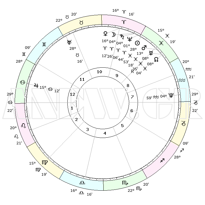 | | ΘΕΣΕΙΣ ΠΛΑΝΗΤΩΝ ΑΣΤΡΟΛΟΓΙΚΟΥ ΧΑΡΤΗ ΤΗΣ ΣΤΙΓΜΗΣ ΑΥΤΗΣ | | | | Πλανήτης | Ζώδιο | Μοίρες | Δεκαήμ. | Σε οίκο | Απόκλιση | | Ακμές των οίκων | | Ηλιος | Ιχθείς | 28°50' | Τρίτο | 10 | 00 S 28 | | 1ος | 12°44' | Καρκίνος | | Σελήνη | Κριός | 03°39' | Πρώτο | 10 | 03 N 28 | | 2ος | 03°09' | Λέων | | Ερμής | Ιχθείς | 08°35'R | Πρώτο | 9 | 07 S 07 | | 3ος | 26°03' | Λέων | | Αφροδίτη | Κριός | 16°08' | Δεύτερο | 10 | 05 N 30 | | 4ος | 24°29' | Παρθένος | | Αρης | Ιχθείς | 13°16' | Δεύτερο | 9 | 07 S 34 | | 5ος | 00°02' | Σκορπιός | | Δίας | Καρκίνος | 15°12' | Δεύτερο | 1 | 22 N 56 | | 6ος | 08°35' | Τοξότης | | Κρόνος | Κριός | 04°06' | Πρώτο | 10 | 00 S 19 | | 7ος | 12°44' | Αιγόκερως | | Ουρανός | Ταύρος | 28°16' | Τρίτο | 11 | 19 N 36 | | 8ος | 03°09' | Υδροχόος | | Ποσειδώνας | Κριός | 01°44' | Πρώτο | 10 | 00 S 31 | | 9ος | 26°03' | Υδροχόος | | Πλούτωνας | Υδροχόος | 04°59' | Πρώτο | 8 | 22 S 49 | | 10ος | 24°29' | Ιχθείς | | Β. Δεσμός | Ιχθείς | 08°04' | Πρώτο | 9 | 08 S 32 | | 11ος | 00°02' | Ταύρος | | Ωροσκόπος | Καρκίνος | 12°44' | Δεύτερο | | | 12ος | 08°35' | Δίδυμοι | | Μεσουράνημα | Ιχθείς | 24°29' | Τρίτο | | | |