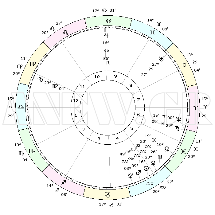 | | ΘΕΣΕΙΣ ΠΛΑΝΗΤΩΝ ΑΣΤΡΟΛΟΓΙΚΟΥ ΧΑΡΤΗ ΤΗΣ ΣΤΙΓΜΗΣ ΑΥΤΗΣ | | | | Πλανήτης | Ζώδιο | Μοίρες | Δεκαήμ. | Σε οίκο | Απόκλιση | | Ακμές των οίκων | | Ηλιος | Υδροχόος | 15°58' | Δεύτερο | 5 | 16 S 03 | | 1ος | 22°10' | Παρθένος | | Σελήνη | Παρθένος | 22°02' | Τρίτο | 12 | 02 N 05 | | 2ος | 18°08' | Ζυγός | | Ερμής | Υδροχόος | 26°11' | Τρίτο | 6 | 14 S 16 | | 3ος | 18°15' | Σκορπιός | | Αφροδίτη | Υδροχόος | 22°56' | Τρίτο | 5 | 15 S 12 | | 4ος | 21°11' | Τοξότης | | Αρης | Υδροχόος | 09°42' | Πρώτο | 5 | 18 S 50 | | 5ος | 24°18' | Αιγόκερως | | Δίας | Καρκίνος | 16°57'R | Δεύτερο | 10 | 22 N 40 | | 6ος | 25°03' | Υδροχόος | | Κρόνος | Ιχθείς | 29°08' | Τρίτο | 7 | 02 S 20 | | 7ος | 22°10' | Ιχθείς | | Ουρανός | Ταύρος | 27°27' | Τρίτο | 9 | 19 N 24 | | 8ος | 18°08' | Κριός | | Ποσειδώνας | Κριός | 00°15' | Πρώτο | 7 | 01 S 06 | | 9ος | 18°15' | Ταύρος | | Πλούτωνας | Υδροχόος | 03°49' | Πρώτο | 5 | 23 S 00 | | 10ος | 21°11' | Δίδυμοι | | Β. Δεσμός | Ιχθείς | 10°20' | Δεύτερο | 6 | 07 S 42 | | 11ος | 24°18' | Καρκίνος | | Ωροσκόπος | Παρθένος | 22°10' | Τρίτο | | | 12ος | 25°03' | Λέων | | Μεσουράνημα | Δίδυμοι | 21°11' | Τρίτο | | | |