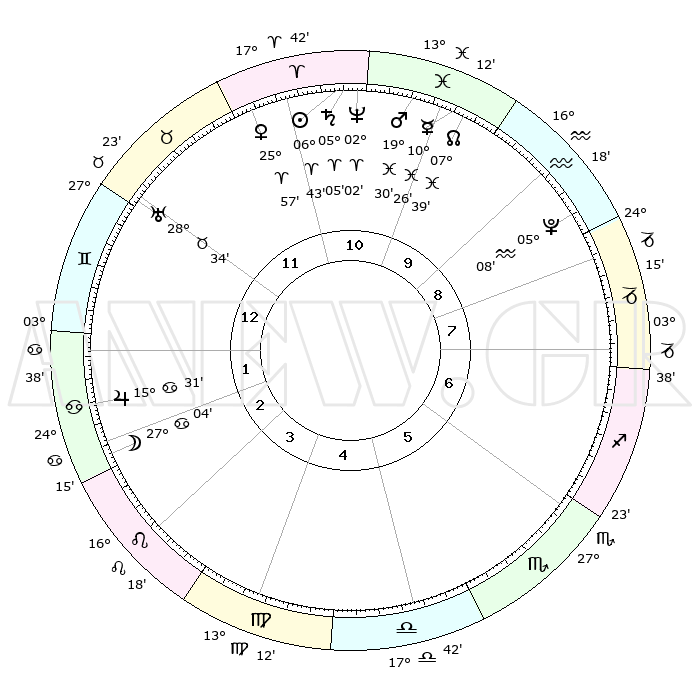 | | ΘΕΣΕΙΣ ΠΛΑΝΗΤΩΝ ΑΣΤΡΟΛΟΓΙΚΟΥ ΧΑΡΤΗ ΤΗΣ ΣΤΙΓΜΗΣ ΑΥΤΗΣ | | | | Πλανήτης | Ζώδιο | Μοίρες | Δεκαήμ. | Σε οίκο | Απόκλιση | | Ακμές των οίκων | | Ηλιος | Κριός | 06°39' | Πρώτο | 11 | 02 N 39 | | 1ος | 13°37' | Δίδυμοι | | Σελήνη | Καρκίνος | 26°17' | Τρίτο | 2 | 24 N 22 | | 2ος | 06°05' | Καρκίνος | | Ερμής | Ιχθείς | 10°24' | Δεύτερο | 10 | 08 S 06 | | 3ος | 27°18' | Καρκίνος | | Αφροδίτη | Κριός | 25°53' | Τρίτο | 11 | 09 N 25 | | 4ος | 21°20' | Λέων | | Αρης | Ιχθείς | 19°28' | Δεύτερο | 10 | 05 S 09 | | 5ος | 22°18' | Παρθένος | | Δίας | Καρκίνος | 15°30' | Δεύτερο | 2 | 22 N 54 | | 6ος | 02°20' | Σκορπιός | | Κρόνος | Κριός | 05°05' | Πρώτο | 11 | 00 N 04 | | 7ος | 13°37' | Τοξότης | | Ουρανός | Ταύρος | 28°34' | Τρίτο | 12 | 19 N 40 | | 8ος | 06°05' | Αιγόκερως | | Ποσειδώνας | Κριός | 02°02' | Πρώτο | 11 | 00 S 23 | | 9ος | 27°18' | Αιγόκερως | | Πλούτωνας | Υδροχόος | 05°08' | Πρώτο | 9 | 22 S 48 | | 10ος | 21°20' | Υδροχόος | | Β. Δεσμός | Ιχθείς | 07°39' | Πρώτο | 10 | 08 S 42 | | 11ος | 22°18' | Ιχθείς | | Ωροσκόπος | Δίδυμοι | 13°37' | Δεύτερο | | | 12ος | 02°20' | Ταύρος | | Μεσουράνημα | Υδροχόος | 21°20' | Τρίτο | | | |