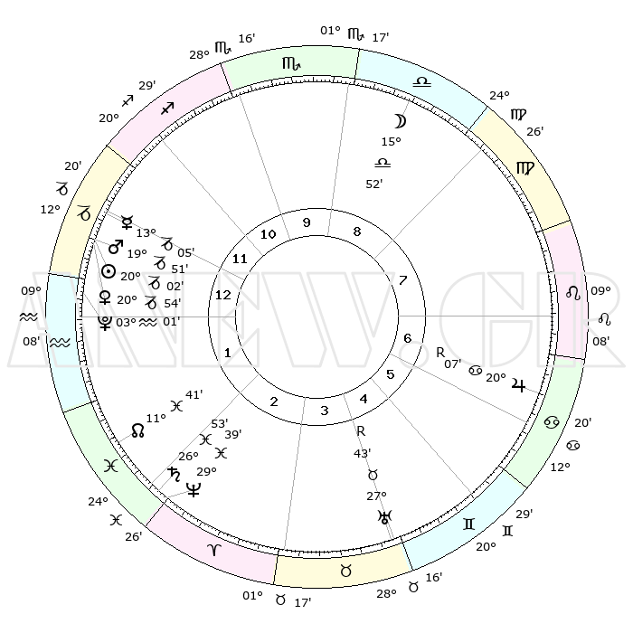 | | ΘΕΣΕΙΣ ΠΛΑΝΗΤΩΝ ΑΣΤΡΟΛΟΓΙΚΟΥ ΧΑΡΤΗ ΤΗΣ ΣΤΙΓΜΗΣ ΑΥΤΗΣ | | | | Πλανήτης | Ζώδιο | Μοίρες | Δεκαήμ. | Σε οίκο | Απόκλιση | | Ακμές των οίκων | | Ηλιος | Αιγόκερως | 19°26' | Δεύτερο | 6 | 22 S 01 | | 1ος | 07°60' | Λέων | | Σελήνη | Ζυγός | 08°43' | Πρώτο | 3 | 05 S 42 | | 2ος | 29°39' | Λέων | | Ερμής | Αιγόκερως | 12°10' | Δεύτερο | 6 | 24 S 17 | | 3ος | 25°47' | Παρθένος | | Αφροδίτη | Αιγόκερως | 20°10' | Τρίτο | 6 | 22 S 43 | | 4ος | 27°41' | Ζυγός | | Αρης | Αιγόκερως | 19°24' | Δεύτερο | 6 | 22 S 58 | | 5ος | 03°24' | Τοξότης | | Δίας | Καρκίνος | 20°11'R | Τρίτο | 12 | 22 N 10 | | 6ος | 07°51' | Αιγόκερως | | Κρόνος | Ιχθείς | 26°51' | Τρίτο | 9 | 03 S 18 | | 7ος | 07°60' | Υδροχόος | | Ουρανός | Ταύρος | 27°44'R | Τρίτο | 10 | 19 N 28 | | 8ος | 29°39' | Υδροχόος | | Ποσειδώνας | Ιχθείς | 29°38' | Τρίτο | 9 | 01 S 22 | | 9ος | 25°47' | Ιχθείς | | Πλούτωνας | Υδροχόος | 02°59' | Πρώτο | 6 | 23 S 10 | | 10ος | 27°41' | Κριός | | Β. Δεσμός | Ιχθείς | 11°42' | Δεύτερο | 8 | 07 S 10 | | 11ος | 03°24' | Δίδυμοι | | Ωροσκόπος | Λέων | 07°60' | Πρώτο | | | 12ος | 07°51' | Καρκίνος | | Μεσουράνημα | Κριός | 27°41' | Τρίτο | | | |