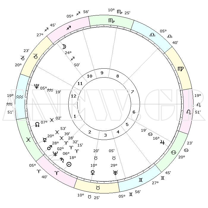 | | ΘΕΣΕΙΣ ΠΛΑΝΗΤΩΝ ΑΣΤΡΟΛΟΓΙΚΟΥ ΧΑΡΤΗ ΤΗΣ ΣΤΙΓΜΗΣ ΑΥΤΗΣ | | | | Πλανήτης | Ζώδιο | Μοίρες | Δεκαήμ. | Σε οίκο | Απόκλιση | | Ακμές των οίκων | | Ηλιος | Κριός | 18°11' | Δεύτερο | 3 | 07 N 08 | | 1ος | 22°29' | Αιγόκερως | | Σελήνη | Τοξότης | 24°06' | Τρίτο | 11 | 28 S 16 | | 2ος | 05°10' | Ιχθείς | | Ερμής | Ιχθείς | 20°48' | Τρίτο | 2 | 05 S 38 | | 3ος | 14°38' | Κριός | | Αφροδίτη | Ταύρος | 10°16' | Δεύτερο | 3 | 14 N 45 | | 4ος | 14°27' | Ταύρος | | Αρης | Ιχθείς | 28°36' | Τρίτο | 2 | 01 S 29 | | 5ος | 07°51' | Δίδυμοι | | Δίας | Καρκίνος | 16°18' | Δεύτερο | 6 | 22 N 49 | | 6ος | 29°05' | Δίδυμοι | | Κρόνος | Κριός | 06°32' | Πρώτο | 2 | 00 N 38 | | 7ος | 22°29' | Καρκίνος | | Ουρανός | Ταύρος | 29°05' | Τρίτο | 4 | 19 N 47 | | 8ος | 05°10' | Παρθένος | | Ποσειδώνας | Κριός | 02°28' | Πρώτο | 2 | 00 S 13 | | 9ος | 14°38' | Ζυγός | | Πλούτωνας | Υδροχόος | 05°19' | Πρώτο | 1 | 22 S 47 | | 10ος | 14°27' | Σκορπιός | | Β. Δεσμός | Ιχθείς | 07°02' | Πρώτο | 2 | 08 S 56 | | 11ος | 07°51' | Τοξότης | | Ωροσκόπος | Αιγόκερως | 22°29' | Τρίτο | | | 12ος | 29°05' | Τοξότης | | Μεσουράνημα | Σκορπιός | 14°27' | Δεύτερο | | | |