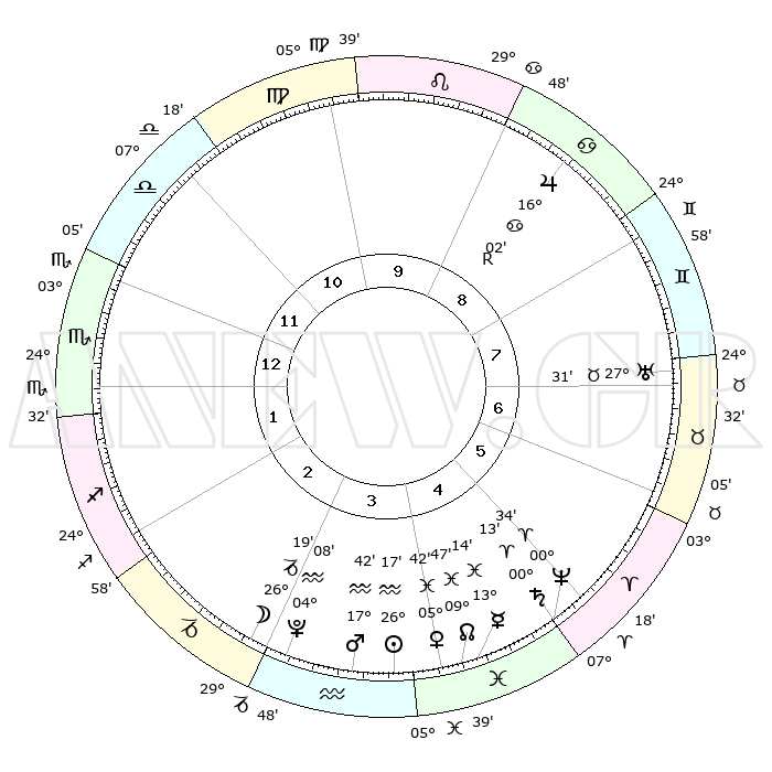 | | ΘΕΣΕΙΣ ΠΛΑΝΗΤΩΝ ΑΣΤΡΟΛΟΓΙΚΟΥ ΧΑΡΤΗ ΤΗΣ ΣΤΙΓΜΗΣ ΑΥΤΗΣ | | | | Πλανήτης | Ζώδιο | Μοίρες | Δεκαήμ. | Σε οίκο | Απόκλιση | | Ακμές των οίκων | | Ηλιος | Υδροχόος | 26°13' | Τρίτο | 4 | 12 S 46 | | 1ος | 08°02' | Σκορπιός | | Σελήνη | Αιγόκερως | 25°37' | Τρίτο | 3 | 24 S 34 | | 2ος | 06°58' | Τοξότης | | Ερμής | Ιχθείς | 13°09' | Δεύτερο | 4 | 06 S 36 | | 3ος | 09°39' | Αιγόκερως | | Αφροδίτη | Ιχθείς | 05°38' | Πρώτο | 4 | 10 S 49 | | 4ος | 14°25' | Υδροχόος | | Αρης | Υδροχόος | 17°39' | Δεύτερο | 4 | 16 S 34 | | 5ος | 17°10' | Ιχθείς | | Δίας | Καρκίνος | 16°02'R | Δεύτερο | 9 | 22 N 48 | | 6ος | 15°02' | Κριός | | Κρόνος | Κριός | 00°13' | Πρώτο | 5 | 01 S 53 | | 7ος | 08°02' | Ταύρος | | Ουρανός | Ταύρος | 27°31' | Τρίτο | 7 | 19 N 25 | | 8ος | 06°58' | Δίδυμοι | | Ποσειδώνας | Κριός | 00°34' | Πρώτο | 5 | 00 S 59 | | 9ος | 09°39' | Καρκίνος | | Πλούτωνας | Υδροχόος | 04°08' | Πρώτο | 3 | 22 S 57 | | 10ος | 14°25' | Λέων | | Β. Δεσμός | Ιχθείς | 09°47' | Πρώτο | 4 | 07 S 54 | | 11ος | 17°10' | Παρθένος | | Ωροσκόπος | Σκορπιός | 08°02' | Πρώτο | | | 12ος | 15°02' | Ζυγός | | Μεσουράνημα | Λέων | 14°25' | Δεύτερο | | | |