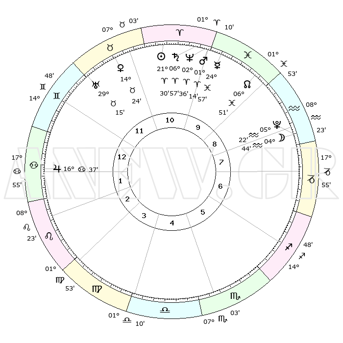 | | ΘΕΣΕΙΣ ΠΛΑΝΗΤΩΝ ΑΣΤΡΟΛΟΓΙΚΟΥ ΧΑΡΤΗ ΤΗΣ ΣΤΙΓΜΗΣ ΑΥΤΗΣ | | | | Πλανήτης | Ζώδιο | Μοίρες | Δεκαήμ. | Σε οίκο | Απόκλιση | | Ακμές των οίκων | | Ηλιος | Κριός | 21°26' | Τρίτο | 11 | 08 N 21 | | 1ος | 26°02' | Δίδυμοι | | Σελήνη | Υδροχόος | 03°53' | Πρώτο | 8 | 22 S 06 | | 2ος | 17°06' | Καρκίνος | | Ερμής | Ιχθείς | 24°51' | Τρίτο | 10 | 04 S 16 | | 3ος | 08°40' | Λέων | | Αφροδίτη | Ταύρος | 14°19' | Δεύτερο | 11 | 16 N 08 | | 4ος | 04°23' | Παρθένος | | Αρης | Κριός | 01°10' | Πρώτο | 10 | 00 S 27 | | 5ος | 07°39' | Ζυγός | | Δίας | Καρκίνος | 16°36' | Δεύτερο | 1 | 22 N 47 | | 6ος | 17°52' | Σκορπιός | | Κρόνος | Κριός | 06°56' | Πρώτο | 10 | 00 N 47 | | 7ος | 26°02' | Τοξότης | | Ουρανός | Ταύρος | 29°14' | Τρίτο | 12 | 19 N 49 | | 8ος | 17°06' | Αιγόκερως | | Ποσειδώνας | Κριός | 02°35' | Πρώτο | 10 | 00 S 10 | | 9ος | 08°40' | Υδροχόος | | Πλούτωνας | Υδροχόος | 05°22' | Πρώτο | 8 | 22 S 47 | | 10ος | 04°23' | Ιχθείς | | Β. Δεσμός | Ιχθείς | 06°51' | Πρώτο | 10 | 09 S 00 | | 11ος | 07°39' | Κριός | | Ωροσκόπος | Δίδυμοι | 26°02' | Τρίτο | | | 12ος | 17°52' | Ταύρος | | Μεσουράνημα | Ιχθείς | 04°23' | Πρώτο | | | |