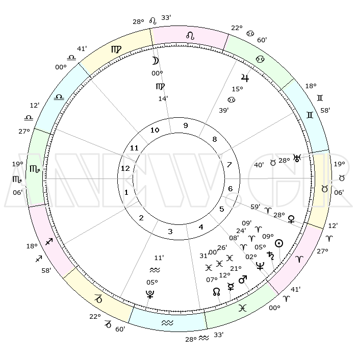 | | ΘΕΣΕΙΣ ΠΛΑΝΗΤΩΝ ΑΣΤΡΟΛΟΓΙΚΟΥ ΧΑΡΤΗ ΤΗΣ ΣΤΙΓΜΗΣ ΑΥΤΗΣ | | | | Πλανήτης | Ζώδιο | Μοίρες | Δεκαήμ. | Σε οίκο | Απόκλιση | | Ακμές των οίκων | | Ηλιος | Κριός | 09°04' | Πρώτο | 6 | 03 N 36 | | 1ος | 29°11' | Ζυγός | | Σελήνη | Λέων | 29°19' | Τρίτο | 10 | 12 N 31 | | 2ος | 27°32' | Σκορπιός | | Ερμής | Ιχθείς | 11°57' | Δεύτερο | 5 | 07 S 56 | | 3ος | 29°26' | Τοξότης | | Αφροδίτη | Κριός | 28°54' | Τρίτο | 6 | 10 N 35 | | 4ος | 03°34' | Υδροχόος | | Αρης | Ιχθείς | 21°23' | Τρίτο | 5 | 04 S 23 | | 5ος | 06°30' | Ιχθείς | | Δίας | Καρκίνος | 15°39' | Δεύτερο | 9 | 22 N 53 | | 6ος | 05°14' | Κριός | | Κρόνος | Κριός | 05°23' | Πρώτο | 6 | 00 N 11 | | 7ος | 29°11' | Κριός | | Ουρανός | Ταύρος | 28°40' | Τρίτο | 8 | 19 N 41 | | 8ος | 27°32' | Ταύρος | | Ποσειδώνας | Κριός | 02°08' | Πρώτο | 5 | 00 S 21 | | 9ος | 29°26' | Δίδυμοι | | Πλούτωνας | Υδροχόος | 05°11' | Πρώτο | 4 | 22 S 48 | | 10ος | 03°34' | Λέων | | Β. Δεσμός | Ιχθείς | 07°31' | Πρώτο | 5 | 08 S 45 | | 11ος | 06°30' | Παρθένος | | Ωροσκόπος | Ζυγός | 29°11' | Τρίτο | | | 12ος | 05°14' | Ζυγός | | Μεσουράνημα | Λέων | 03°34' | Πρώτο | | | |