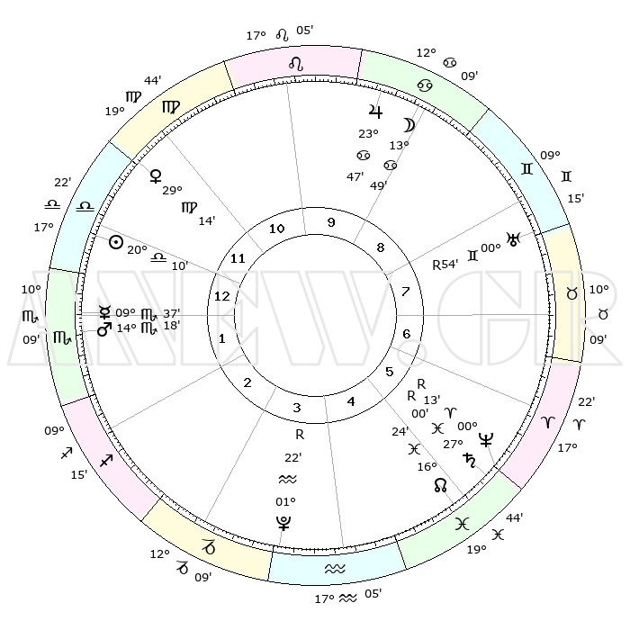 | ΘΕΣΕΙΣ ΠΛΑΝΗΤΩΝ ΑΣΤΡΟΛΟΓΙΚΟΥ ΧΑΡΤΗ ΤΗΣ ΣΤΙΓΜΗΣ ΑΥΤΗΣ | | Πλανήτης | Ζώδιο | Μοίρες | Δεκαήμ. | Σε οίκο | Απόκλιση | | Ακμές των οίκων | Ηλιος | Ζυγός | 20°04' | Τρίτο | 1 | 07 S 51 | | 1ος | 09°20' | Ζυγός | Σελήνη | Καρκίνος | 12°22' | Δεύτερο | 10 | 27 N 35 | | 2ος | 06°33' | Σκορπιός | Ερμής | Σκορπιός | 09°28' | Πρώτο | 2 | 16 S 06 | | 3ος | 07°20' | Τοξότης | Αφροδίτη | Παρθένος | 29°06' | Τρίτο | 12 | 01 N 44 | | 4ος | 10°30' | Αιγόκερως | Αρης | Σκορπιός | 14°14' | Δεύτερο | 2 | 16 S 18 | | 5ος | 13°26' | Υδροχόος | Δίας | Καρκίνος | 23°46' | Τρίτο | 10 | 21 N 23 | | 6ος | 13°29' | Ιχθείς | Κρόνος | Ιχθείς | 27°01'R | Τρίτο | 6 | 03 S 29 | | 7ος | 09°20' | Κριός | Ουρανός | Δίδυμοι | 00°54'R | Πρώτο | 8 | 20 N 08 | | 8ος | 06°33' | Ταύρος | Ποσειδώνας | Κριός | 00°13'R | Πρώτο | 6 | 01 S 10 | | 9ος | 07°20' | Δίδυμοι | Πλούτωνας | Υδροχόος | 01°22'R | Πρώτο | 4 | 23 S 32 | | 10ος | 10°30' | Καρκίνος | Β. Δεσμός | Ιχθείς | 16°24' | Δεύτερο | 6 | 05 S 22 | | 11ος | 13°26' | Λέων | Ωροσκόπος | Ζυγός | 09°20' | Πρώτο | | | 12ος | 13°29' | Παρθένος | Μεσουράνημα | Καρκίνος | 10°30' | Δεύτερο | | | |