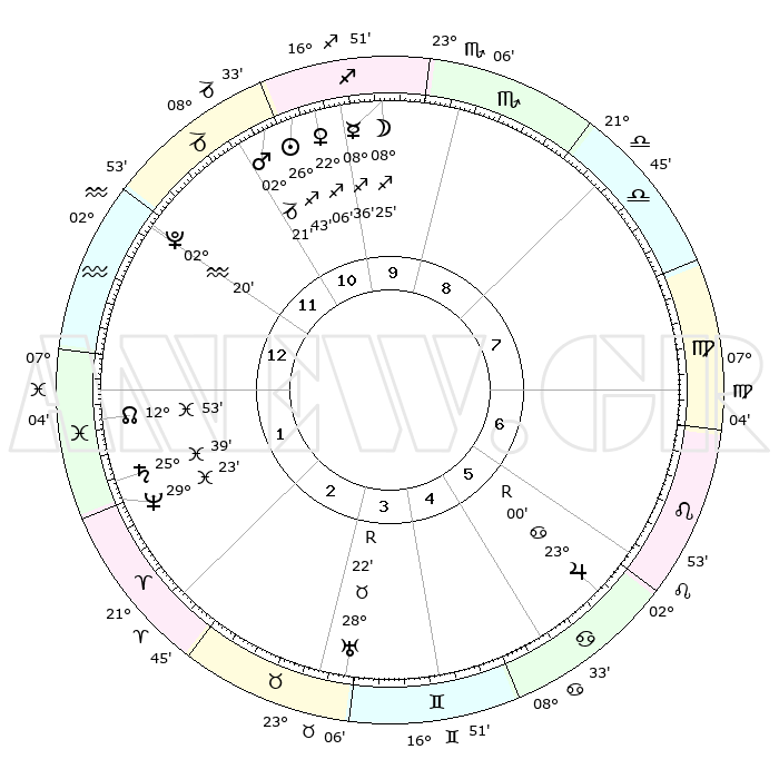 | | ΘΕΣΕΙΣ ΠΛΑΝΗΤΩΝ ΑΣΤΡΟΛΟΓΙΚΟΥ ΧΑΡΤΗ ΤΗΣ ΣΤΙΓΜΗΣ ΑΥΤΗΣ | | | | Πλανήτης | Ζώδιο | Μοίρες | Δεκαήμ. | Σε οίκο | Απόκλιση | | Ακμές των οίκων | | Ηλιος | Τοξότης | 26°23' | Τρίτο | 2 | 23 S 23 | | 1ος | 08°51' | Σκορπιός | | Σελήνη | Τοξότης | 04°32' | Πρώτο | 1 | 25 S 55 | | 2ος | 07°50' | Τοξότης | | Ερμής | Τοξότης | 08°08' | Πρώτο | 2 | 20 S 32 | | 3ος | 10°37' | Αιγόκερως | | Αφροδίτη | Τοξότης | 21°42' | Τρίτο | 2 | 23 S 08 | | 4ος | 15°26' | Υδροχόος | | Αρης | Αιγόκερως | 02°06' | Πρώτο | 2 | 24 S 13 | | 5ος | 18°09' | Ιχθείς | | Δίας | Καρκίνος | 23°02'R | Τρίτο | 9 | 21 N 40 | | 6ος | 15°55' | Κριός | | Κρόνος | Ιχθείς | 25°38' | Τρίτο | 5 | 03 S 51 | | 7ος | 08°51' | Ταύρος | | Ουρανός | Ταύρος | 28°23'R | Τρίτο | 7 | 19 N 36 | | 8ος | 07°50' | Δίδυμοι | | Ποσειδώνας | Ιχθείς | 29°23' | Τρίτο | 5 | 01 S 28 | | 9ος | 10°37' | Καρκίνος | | Πλούτωνας | Υδροχόος | 02°19' | Πρώτο | 3 | 23 S 18 | | 10ος | 15°26' | Λέων | | Β. Δεσμός | Ιχθείς | 12°54' | Δεύτερο | 4 | 06 S 43 | | 11ος | 18°09' | Παρθένος | | Ωροσκόπος | Σκορπιός | 08°51' | Πρώτο | | | 12ος | 15°55' | Ζυγός | | Μεσουράνημα | Λέων | 15°26' | Δεύτερο | | | |