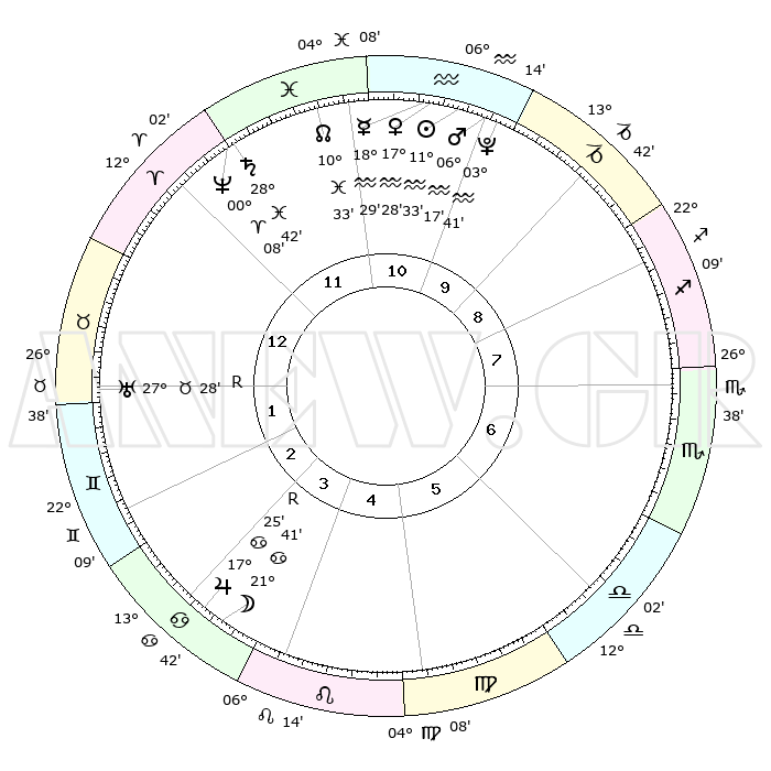 | | ΘΕΣΕΙΣ ΠΛΑΝΗΤΩΝ ΑΣΤΡΟΛΟΓΙΚΟΥ ΧΑΡΤΗ ΤΗΣ ΣΤΙΓΜΗΣ ΑΥΤΗΣ | | | | Πλανήτης | Ζώδιο | Μοίρες | Δεκαήμ. | Σε οίκο | Απόκλιση | | Ακμές των οίκων | | Ηλιος | Υδροχόος | 11°29' | Δεύτερο | 11 | 17 S 20 | | 1ος | 24°53' | Κριός | | Σελήνη | Καρκίνος | 20°45' | Τρίτο | 4 | 25 N 41 | | 2ος | 28°32' | Ταύρος | | Ερμής | Υδροχόος | 18°22' | Δεύτερο | 11 | 17 S 09 | | 3ος | 22°38' | Δίδυμοι | | Αφροδίτη | Υδροχόος | 17°24' | Δεύτερο | 11 | 16 S 54 | | 4ος | 14°19' | Καρκίνος | | Αρης | Υδροχόος | 06°14' | Πρώτο | 10 | 19 S 43 | | 5ος | 08°15' | Λέων | | Δίας | Καρκίνος | 17°26'R | Δεύτερο | 4 | 22 N 36 | | 6ος | 09°58' | Παρθένος | | Κρόνος | Ιχθείς | 28°42' | Τρίτο | 12 | 02 S 31 | | 7ος | 24°53' | Ζυγός | | Ουρανός | Ταύρος | 27°28'R | Τρίτο | 1 | 19 N 24 | | 8ος | 28°32' | Σκορπιός | | Ποσειδώνας | Κριός | 00°08' | Πρώτο | 12 | 01 S 09 | | 9ος | 22°38' | Τοξότης | | Πλούτωνας | Υδροχόος | 03°41' | Πρώτο | 10 | 23 S 02 | | 10ος | 14°19' | Αιγόκερως | | Β. Δεσμός | Ιχθείς | 10°34' | Δεύτερο | 12 | 07 S 36 | | 11ος | 08°15' | Υδροχόος | | Ωροσκόπος | Κριός | 24°53' | Τρίτο | | | 12ος | 09°58' | Ιχθείς | | Μεσουράνημα | Αιγόκερως | 14°19' | Δεύτερο | | | |