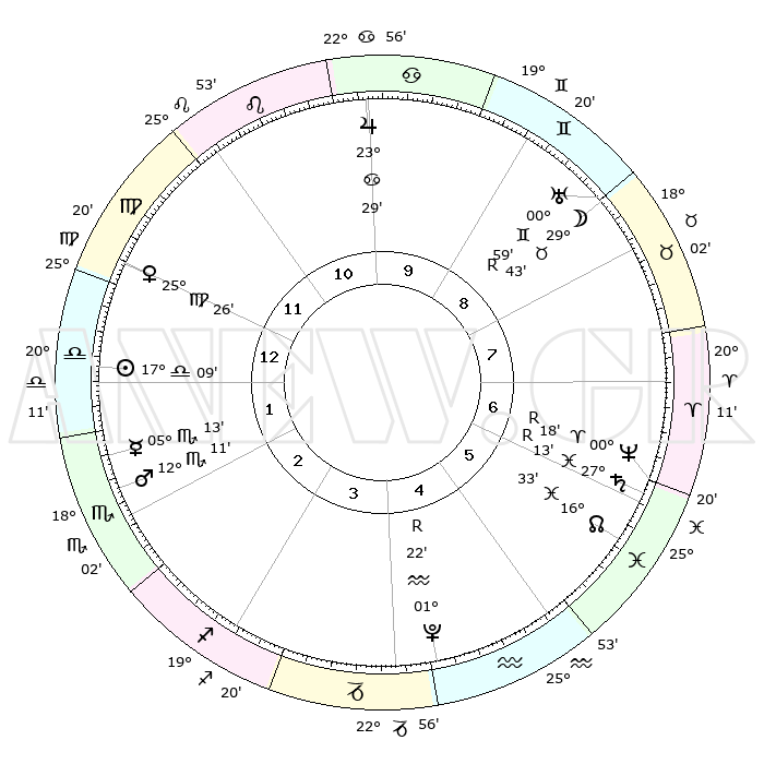 | ΘΕΣΕΙΣ ΠΛΑΝΗΤΩΝ ΑΣΤΡΟΛΟΓΙΚΟΥ ΧΑΡΤΗ ΤΗΣ ΣΤΙΓΜΗΣ ΑΥΤΗΣ | | Πλανήτης | Ζώδιο | Μοίρες | Δεκαήμ. | Σε οίκο | Απόκλιση | | Ακμές των οίκων | Ηλιος | Ζυγός | 16°48' | Δεύτερο | 4 | 06 S 36 | | 1ος | 06°26' | Καρκίνος | Σελήνη | Ταύρος | 24°28' | Τρίτο | 11 | 23 N 31 | | 2ος | 26°56' | Καρκίνος | Ερμής | Σκορπιός | 04°42' | Πρώτο | 5 | 14 S 10 | | 3ος | 19°13' | Λέων | Αφροδίτη | Παρθένος | 25°00' | Τρίτο | 4 | 03 N 19 | | 4ος | 16°36' | Παρθένος | Αρης | Σκορπιός | 11°56' | Δεύτερο | 5 | 15 S 35 | | 5ος | 21°27' | Ζυγός | Δίας | Καρκίνος | 23°27' | Τρίτο | 1 | 21 N 26 | | 6ος | 00°51' | Τοξότης | Κρόνος | Ιχθείς | 27°14'R | Τρίτο | 10 | 03 S 24 | | 7ος | 06°26' | Αιγόκερως | Ουρανός | Δίδυμοι | 00°60'R | Πρώτο | 12 | 20 N 09 | | 8ος | 26°56' | Αιγόκερως | Ποσειδώνας | Κριός | 00°19'R | Πρώτο | 10 | 01 S 08 | | 9ος | 19°13' | Υδροχόος | Πλούτωνας | Υδροχόος | 01°22'R | Πρώτο | 8 | 23 S 32 | | 10ος | 16°36' | Ιχθείς | Β. Δεσμός | Ιχθείς | 16°34' | Δεύτερο | 9 | 05 S 18 | | 11ος | 21°27' | Κριός | Ωροσκόπος | Καρκίνος | 06°26' | Πρώτο | | | 12ος | 00°51' | Δίδυμοι | Μεσουράνημα | Ιχθείς | 16°36' | Δεύτερο | | | |