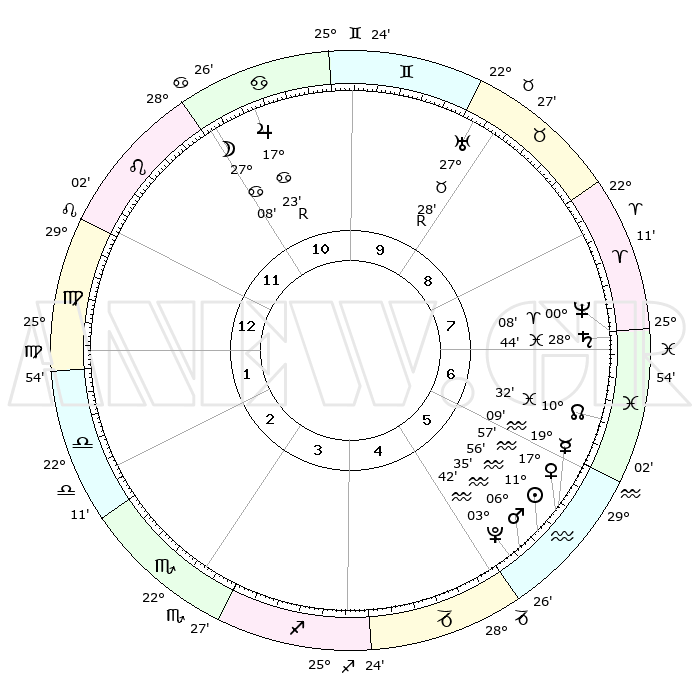 | | ΘΕΣΕΙΣ ΠΛΑΝΗΤΩΝ ΑΣΤΡΟΛΟΓΙΚΟΥ ΧΑΡΤΗ ΤΗΣ ΣΤΙΓΜΗΣ ΑΥΤΗΣ | | | | Πλανήτης | Ζώδιο | Μοίρες | Δεκαήμ. | Σε οίκο | Απόκλιση | | Ακμές των οίκων | | Ηλιος | Υδροχόος | 11°52' | Δεύτερο | 6 | 17 S 14 | | 1ος | 05°42' | Παρθένος | | Σελήνη | Καρκίνος | 26°09' | Τρίτο | 11 | 24 N 25 | | 2ος | 00°09' | Ζυγός | | Ερμής | Υδροχόος | 19°01' | Δεύτερο | 6 | 16 S 55 | | 3ος | 29°18' | Ζυγός | | Αφροδίτη | Υδροχόος | 17°52' | Δεύτερο | 6 | 16 S 46 | | 4ος | 02°15' | Τοξότης | | Αρης | Υδροχόος | 06°32' | Πρώτο | 5 | 19 S 39 | | 5ος | 06°05' | Αιγόκερως | | Δίας | Καρκίνος | 17°23'R | Δεύτερο | 11 | 22 N 36 | | 6ος | 07°38' | Υδροχόος | | Κρόνος | Ιχθείς | 28°44' | Τρίτο | 7 | 02 S 30 | | 7ος | 05°42' | Ιχθείς | | Ουρανός | Ταύρος | 27°28'R | Τρίτο | 9 | 19 N 24 | | 8ος | 00°09' | Κριός | | Ποσειδώνας | Κριός | 00°08' | Πρώτο | 7 | 01 S 09 | | 9ος | 29°18' | Κριός | | Πλούτωνας | Υδροχόος | 03°42' | Πρώτο | 5 | 23 S 01 | | 10ος | 02°15' | Δίδυμοι | | Β. Δεσμός | Ιχθείς | 10°33' | Δεύτερο | 7 | 07 S 37 | | 11ος | 06°05' | Καρκίνος | | Ωροσκόπος | Παρθένος | 05°42' | Πρώτο | | | 12ος | 07°38' | Λέων | | Μεσουράνημα | Δίδυμοι | 02°15' | Πρώτο | | | |