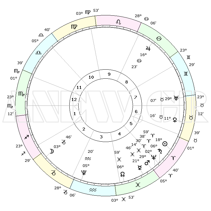 | | ΘΕΣΕΙΣ ΠΛΑΝΗΤΩΝ ΑΣΤΡΟΛΟΓΙΚΟΥ ΧΑΡΤΗ ΤΗΣ ΣΤΙΓΜΗΣ ΑΥΤΗΣ | | | | Πλανήτης | Ζώδιο | Μοίρες | Δεκαήμ. | Σε οίκο | Απόκλιση | | Ακμές των οίκων | | Ηλιος | Κριός | 18°55' | Δεύτερο | 6 | 07 N 24 | | 1ος | 03°29' | Σκορπιός | | Σελήνη | Αιγόκερως | 02°58' | Πρώτο | 2 | 28 S 05 | | 2ος | 02°07' | Τοξότης | | Ερμής | Ιχθείς | 21°41' | Τρίτο | 5 | 05 S 21 | | 3ος | 04°21' | Αιγόκερως | | Αφροδίτη | Ταύρος | 11°11' | Δεύτερο | 7 | 15 N 04 | | 4ος | 08°48' | Υδροχόος | | Αρης | Ιχθείς | 29°11' | Τρίτο | 5 | 01 S 15 | | 5ος | 11°39' | Ιχθείς | | Δίας | Καρκίνος | 16°22' | Δεύτερο | 9 | 22 N 48 | | 6ος | 09°60' | Κριός | | Κρόνος | Κριός | 06°37' | Πρώτο | 5 | 00 N 40 | | 7ος | 03°29' | Ταύρος | | Ουρανός | Ταύρος | 29°07' | Τρίτο | 7 | 19 N 47 | | 8ος | 02°07' | Δίδυμοι | | Ποσειδώνας | Κριός | 02°30' | Πρώτο | 5 | 00 S 13 | | 9ος | 04°21' | Καρκίνος | | Πλούτωνας | Υδροχόος | 05°20' | Πρώτο | 3 | 22 S 47 | | 10ος | 08°48' | Λέων | | Β. Δεσμός | Ιχθείς | 06°60' | Πρώτο | 4 | 08 S 57 | | 11ος | 11°39' | Παρθένος | | Ωροσκόπος | Σκορπιός | 03°29' | Πρώτο | | | 12ος | 09°60' | Ζυγός | | Μεσουράνημα | Λέων | 08°48' | Πρώτο | | | |