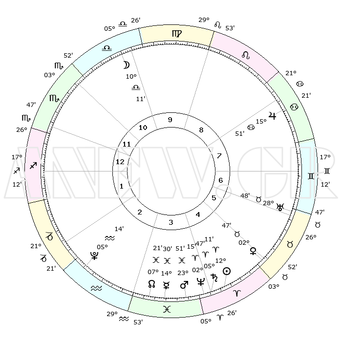 | | ΘΕΣΕΙΣ ΠΛΑΝΗΤΩΝ ΑΣΤΡΟΛΟΓΙΚΟΥ ΧΑΡΤΗ ΤΗΣ ΣΤΙΓΜΗΣ ΑΥΤΗΣ | | | | Πλανήτης | Ζώδιο | Μοίρες | Δεκαήμ. | Σε οίκο | Απόκλιση | | Ακμές των οίκων | | Ηλιος | Κριός | 12°08' | Δεύτερο | 5 | 04 N 48 | | 1ος | 27°44' | Σκορπιός | | Σελήνη | Ζυγός | 09°22' | Πρώτο | 10 | 06 S 09 | | 2ος | 28°34' | Τοξότης | | Ερμής | Ιχθείς | 14°27' | Δεύτερο | 4 | 07 S 27 | | 3ος | 03°54' | Υδροχόος | | Αφροδίτη | Ταύρος | 02°42' | Πρώτο | 5 | 12 N 01 | | 4ος | 09°53' | Ιχθείς | | Αρης | Ιχθείς | 23°48' | Τρίτο | 4 | 03 S 25 | | 5ος | 11°11' | Κριός | | Δίας | Καρκίνος | 15°50' | Δεύτερο | 8 | 22 N 52 | | 6ος | 06°33' | Ταύρος | | Κρόνος | Κριός | 05°46' | Πρώτο | 4 | 00 N 20 | | 7ος | 27°44' | Ταύρος | | Ουρανός | Ταύρος | 28°48' | Τρίτο | 7 | 19 N 43 | | 8ος | 28°34' | Δίδυμοι | | Ποσειδώνας | Κριός | 02°15' | Πρώτο | 4 | 00 S 19 | | 9ος | 03°54' | Λέων | | Πλούτωνας | Υδροχόος | 05°14' | Πρώτο | 3 | 22 S 47 | | 10ος | 09°53' | Παρθένος | | Β. Δεσμός | Ιχθείς | 07°21' | Πρώτο | 3 | 08 S 48 | | 11ος | 11°11' | Ζυγός | | Ωροσκόπος | Σκορπιός | 27°44' | Τρίτο | | | 12ος | 06°33' | Σκορπιός | | Μεσουράνημα | Παρθένος | 09°53' | Πρώτο | | | |