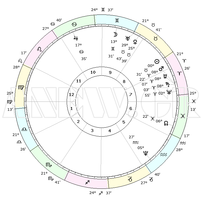 | | ΘΕΣΕΙΣ ΠΛΑΝΗΤΩΝ ΑΣΤΡΟΛΟΓΙΚΟΥ ΧΑΡΤΗ ΤΗΣ ΣΤΙΓΜΗΣ ΑΥΤΗΣ | | | | Πλανήτης | Ζώδιο | Μοίρες | Δεκαήμ. | Σε οίκο | Απόκλιση | | Ακμές των οίκων | | Ηλιος | Ταύρος | 00°28' | Πρώτο | 8 | 11 N 38 | | 1ος | 08°40' | Παρθένος | | Σελήνη | Δίδυμοι | 12°41' | Δεύτερο | 10 | 27 N 21 | | 2ος | 03°25' | Ζυγός | | Ερμής | Κριός | 08°02' | Πρώτο | 8 | 00 N 47 | | 3ος | 02°47' | Σκορπιός | | Αφροδίτη | Ταύρος | 25°35' | Τρίτο | 9 | 19 N 34 | | 4ος | 05°44' | Τοξότης | | Αρης | Κριός | 08°20' | Πρώτο | 8 | 02 N 26 | | 5ος | 09°24' | Αιγόκερως | | Δίας | Καρκίνος | 17°34' | Δεύτερο | 11 | 22 N 40 | | 6ος | 10°46' | Υδροχόος | | Κρόνος | Κριός | 08°03' | Πρώτο | 8 | 01 N 13 | | 7ος | 08°40' | Ιχθείς | | Ουρανός | Ταύρος | 29°43' | Τρίτο | 9 | 19 N 55 | | 8ος | 03°25' | Κριός | | Ποσειδώνας | Κριός | 02°55' | Πρώτο | 7 | 00 S 03 | | 9ος | 02°47' | Ταύρος | | Πλούτωνας | Υδροχόος | 05°27' | Πρώτο | 5 | 22 S 48 | | 10ος | 05°44' | Δίδυμοι | | Β. Δεσμός | Ιχθείς | 06°22' | Πρώτο | 6 | 09 S 10 | | 11ος | 09°24' | Καρκίνος | | Ωροσκόπος | Παρθένος | 08°40' | Πρώτο | | | 12ος | 10°46' | Λέων | | Μεσουράνημα | Δίδυμοι | 05°44' | Πρώτο | | | |