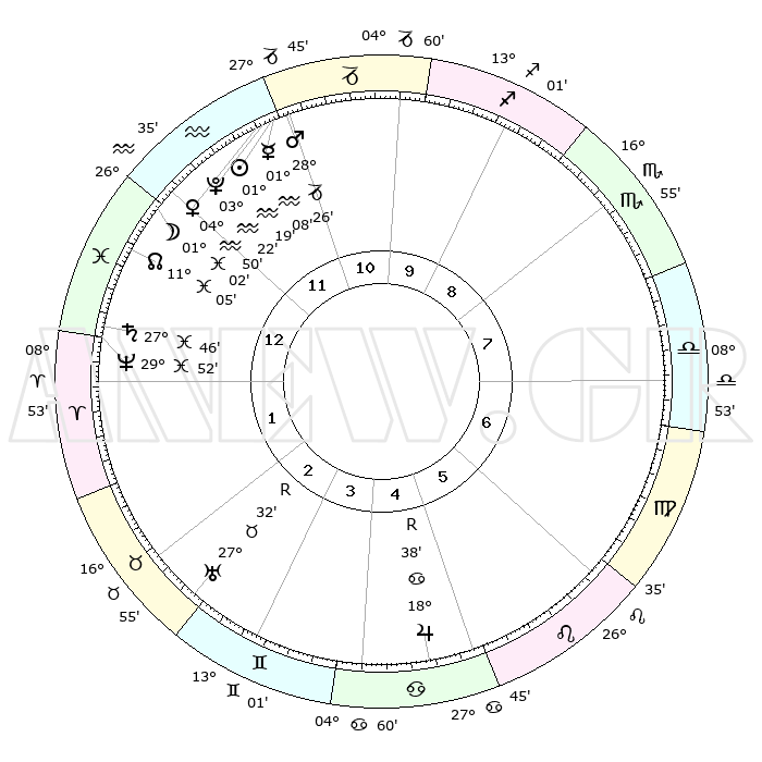 | | ΘΕΣΕΙΣ ΠΛΑΝΗΤΩΝ ΑΣΤΡΟΛΟΓΙΚΟΥ ΧΑΡΤΗ ΤΗΣ ΣΤΙΓΜΗΣ ΑΥΤΗΣ | | | | Πλανήτης | Ζώδιο | Μοίρες | Δεκαήμ. | Σε οίκο | Απόκλιση | | Ακμές των οίκων | | Ηλιος | Υδροχόος | 01°15' | Πρώτο | 12 | 19 S 53 | | 1ος | 00°27' | Ιχθείς | | Σελήνη | Ιχθείς | 00°10' | Πρώτο | 12 | 12 S 11 | | 2ος | 15°50' | Κριός | | Ερμής | Υδροχόος | 01°01' | Πρώτο | 12 | 21 S 55 | | 3ος | 18°28' | Ταύρος | | Αφροδίτη | Υδροχόος | 04°45' | Πρώτο | 12 | 20 S 11 | | 4ος | 12°49' | Δίδυμοι | | Αρης | Αιγόκερως | 28°23' | Τρίτο | 12 | 21 S 28 | | 5ος | 04°30' | Καρκίνος | | Δίας | Καρκίνος | 18°39'R | Δεύτερο | 5 | 22 N 25 | | 6ος | 28°07' | Καρκίνος | | Κρόνος | Ιχθείς | 27°46' | Τρίτο | 1 | 02 S 54 | | 7ος | 00°27' | Παρθένος | | Ουρανός | Ταύρος | 27°32'R | Τρίτο | 3 | 19 N 25 | | 8ος | 15°50' | Ζυγός | | Ποσειδώνας | Ιχθείς | 29°52' | Τρίτο | 1 | 01 S 16 | | 9ος | 18°28' | Σκορπιός | | Πλούτωνας | Υδροχόος | 03°22' | Πρώτο | 12 | 23 S 05 | | 10ος | 12°49' | Τοξότης | | Β. Δεσμός | Ιχθείς | 11°06' | Δεύτερο | 1 | 07 S 24 | | 11ος | 04°30' | Αιγόκερως | | Ωροσκόπος | Ιχθείς | 00°27' | Πρώτο | | | 12ος | 28°07' | Αιγόκερως | | Μεσουράνημα | Τοξότης | 12°49' | Δεύτερο | | | |