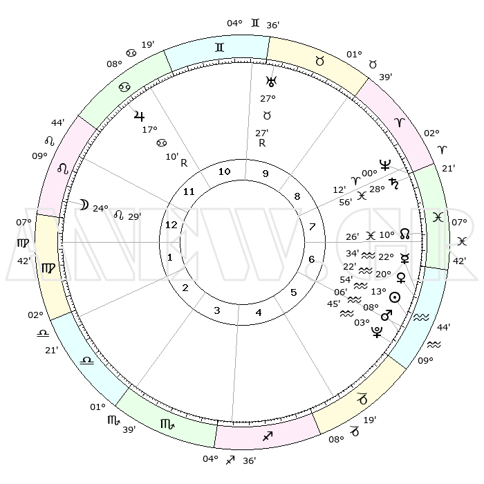 | | ΘΕΣΕΙΣ ΠΛΑΝΗΤΩΝ ΑΣΤΡΟΛΟΓΙΚΟΥ ΧΑΡΤΗ ΤΗΣ ΣΤΙΓΜΗΣ ΑΥΤΗΣ | | | | Πλανήτης | Ζώδιο | Μοίρες | Δεκαήμ. | Σε οίκο | Απόκλιση | | Ακμές των οίκων | | Ηλιος | Υδροχόος | 13°50' | Δεύτερο | 6 | 16 S 40 | | 1ος | 20°56' | Λέων | | Σελήνη | Λέων | 23°41' | Τρίτο | 1 | 14 N 56 | | 2ος | 13°50' | Παρθένος | | Ερμής | Υδροχόος | 22°28' | Τρίτο | 7 | 15 S 42 | | 3ος | 11°35' | Ζυγός | | Αφροδίτη | Υδροχόος | 20°18' | Τρίτο | 6 | 16 S 02 | | 4ος | 14°18' | Σκορπιός | | Αρης | Υδροχόος | 08°03' | Πρώτο | 6 | 19 S 16 | | 5ος | 19°08' | Τοξότης | | Δίας | Καρκίνος | 17°10'R | Δεύτερο | 11 | 22 N 38 | | 6ος | 21°56' | Αιγόκερως | | Κρόνος | Ιχθείς | 28°55' | Τρίτο | 8 | 02 S 25 | | 7ος | 20°56' | Υδροχόος | | Ουρανός | Ταύρος | 27°27'R | Τρίτο | 10 | 19 N 24 | | 8ος | 13°50' | Ιχθείς | | Ποσειδώνας | Κριός | 00°11' | Πρώτο | 8 | 01 S 08 | | 9ος | 11°35' | Κριός | | Πλούτωνας | Υδροχόος | 03°45' | Πρώτο | 6 | 23 S 01 | | 10ος | 14°18' | Ταύρος | | Β. Δεσμός | Ιχθείς | 10°26' | Δεύτερο | 7 | 07 S 39 | | 11ος | 19°08' | Δίδυμοι | | Ωροσκόπος | Λέων | 20°56' | Τρίτο | | | 12ος | 21°56' | Καρκίνος | | Μεσουράνημα | Ταύρος | 14°18' | Δεύτερο | | | |