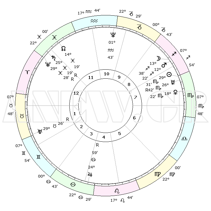 | | ΘΕΣΕΙΣ ΠΛΑΝΗΤΩΝ ΑΣΤΡΟΛΟΓΙΚΟΥ ΧΑΡΤΗ ΤΗΣ ΣΤΙΓΜΗΣ ΑΥΤΗΣ | | | | Πλανήτης | Ζώδιο | Μοίρες | Δεκαήμ. | Σε οίκο | Απόκλιση | | Ακμές των οίκων | | Ηλιος | Σκορπιός | 29°28' | Τρίτο | 8 | 20 S 02 | | 1ος | 10°58' | Κριός | | Σελήνη | Τοξότης | 13°03' | Δεύτερο | 8 | 27 S 19 | | 2ος | 18°27' | Ταύρος | | Ερμής | Σκορπιός | 26°46'R | Τρίτο | 8 | 18 S 32 | | 3ος | 14°16' | Δίδυμοι | | Αφροδίτη | Σκορπιός | 18°19' | Δεύτερο | 7 | 16 S 18 | | 4ος | 06°11' | Καρκίνος | | Αρης | Τοξότης | 12°19' | Δεύτερο | 8 | 22 S 51 | | 5ος | 29°04' | Καρκίνος | | Δίας | Καρκίνος | 24°59'R | Τρίτο | 4 | 21 N 16 | | 6ος | 28°15' | Λέων | | Κρόνος | Ιχθείς | 25°19'R | Τρίτο | 12 | 04 S 04 | | 7ος | 10°58' | Ζυγός | | Ουρανός | Ταύρος | 29°26'R | Τρίτο | 2 | 19 N 49 | | 8ος | 18°27' | Σκορπιός | | Ποσειδώνας | Ιχθείς | 29°28'R | Τρίτο | 12 | 01 S 27 | | 9ος | 14°16' | Τοξότης | | Πλούτωνας | Υδροχόος | 01°43' | Πρώτο | 11 | 23 S 27 | | 10ος | 06°11' | Αιγόκερως | | Β. Δεσμός | Ιχθείς | 14°19' | Δεύτερο | 12 | 06 S 10 | | 11ος | 29°04' | Αιγόκερως | | Ωροσκόπος | Κριός | 10°58' | Δεύτερο | | | 12ος | 28°15' | Υδροχόος | | Μεσουράνημα | Αιγόκερως | 06°11' | Πρώτο | | | |