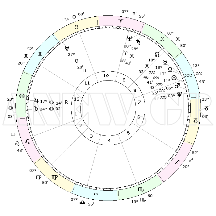 | | ΘΕΣΕΙΣ ΠΛΑΝΗΤΩΝ ΑΣΤΡΟΛΟΓΙΚΟΥ ΧΑΡΤΗ ΤΗΣ ΣΤΙΓΜΗΣ ΑΥΤΗΣ | | | | Πλανήτης | Ζώδιο | Μοίρες | Δεκαήμ. | Σε οίκο | Απόκλιση | | Ακμές των οίκων | | Ηλιος | Υδροχόος | 11°39' | Δεύτερο | 8 | 17 S 17 | | 1ος | 04°15' | Καρκίνος | | Σελήνη | Καρκίνος | 23°09' | Τρίτο | 1 | 25 N 09 | | 2ος | 24°50' | Καρκίνος | | Ερμής | Υδροχόος | 18°39' | Δεύτερο | 9 | 17 S 03 | | 3ος | 16°57' | Λέων | | Αφροδίτη | Υδροχόος | 17°36' | Δεύτερο | 9 | 16 S 51 | | 4ος | 13°57' | Παρθένος | | Αρης | Υδροχόος | 06°22' | Πρώτο | 8 | 19 S 41 | | 5ος | 18°31' | Ζυγός | | Δίας | Καρκίνος | 17°24'R | Δεύτερο | 1 | 22 N 36 | | 6ος | 28°09' | Σκορπιός | | Κρόνος | Ιχθείς | 28°43' | Τρίτο | 10 | 02 S 31 | | 7ος | 04°15' | Αιγόκερως | | Ουρανός | Ταύρος | 27°28'R | Τρίτο | 11 | 19 N 24 | | 8ος | 24°50' | Αιγόκερως | | Ποσειδώνας | Κριός | 00°08' | Πρώτο | 10 | 01 S 09 | | 9ος | 16°57' | Υδροχόος | | Πλούτωνας | Υδροχόος | 03°41' | Πρώτο | 8 | 23 S 01 | | 10ος | 13°57' | Ιχθείς | | Β. Δεσμός | Ιχθείς | 10°33' | Δεύτερο | 9 | 07 S 36 | | 11ος | 18°31' | Κριός | | Ωροσκόπος | Καρκίνος | 04°15' | Πρώτο | | | 12ος | 28°09' | Ταύρος | | Μεσουράνημα | Ιχθείς | 13°57' | Δεύτερο | | | |