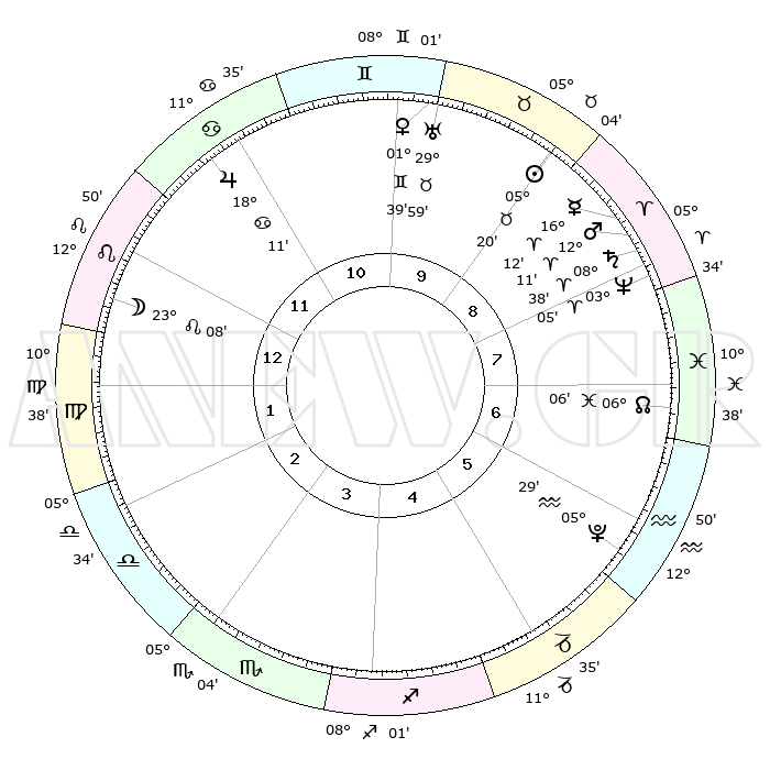 | | ΘΕΣΕΙΣ ΠΛΑΝΗΤΩΝ ΑΣΤΡΟΛΟΓΙΚΟΥ ΧΑΡΤΗ ΤΗΣ ΣΤΙΓΜΗΣ ΑΥΤΗΣ | | | | Πλανήτης | Ζώδιο | Μοίρες | Δεκαήμ. | Σε οίκο | Απόκλιση | | Ακμές των οίκων | | Ηλιος | Ταύρος | 05°16' | Πρώτο | 9 | 13 N 17 | | 1ος | 23°38' | Λέων | | Σελήνη | Λέων | 22°21' | Τρίτο | 12 | 15 N 18 | | 2ος | 16°49' | Παρθένος | | Ερμής | Κριός | 16°06' | Δεύτερο | 9 | 04 N 07 | | 3ος | 14°52' | Ζυγός | | Αφροδίτη | Δίδυμοι | 01°35' | Πρώτο | 10 | 21 N 07 | | 4ος | 17°39' | Σκορπιός | | Αρης | Κριός | 12°08' | Δεύτερο | 8 | 03 N 57 | | 5ος | 22°18' | Τοξότης | | Δίας | Καρκίνος | 18°11' | Δεύτερο | 11 | 22 N 35 | | 6ος | 24°49' | Αιγόκερως | | Κρόνος | Κριός | 08°38' | Πρώτο | 8 | 01 N 26 | | 7ος | 23°38' | Υδροχόος | | Ουρανός | Ταύρος | 29°58' | Τρίτο | 10 | 19 N 59 | | 8ος | 16°49' | Ιχθείς | | Ποσειδώνας | Κριός | 03°05' | Πρώτο | 8 | 00 N 01 | | 9ος | 14°52' | Κριός | | Πλούτωνας | Υδροχόος | 05°29' | Πρώτο | 6 | 22 S 48 | | 10ος | 17°39' | Ταύρος | | Β. Δεσμός | Ιχθείς | 06°06' | Πρώτο | 7 | 09 S 16 | | 11ος | 22°18' | Δίδυμοι | | Ωροσκόπος | Λέων | 23°38' | Τρίτο | | | 12ος | 24°49' | Καρκίνος | | Μεσουράνημα | Ταύρος | 17°39' | Δεύτερο | | | |